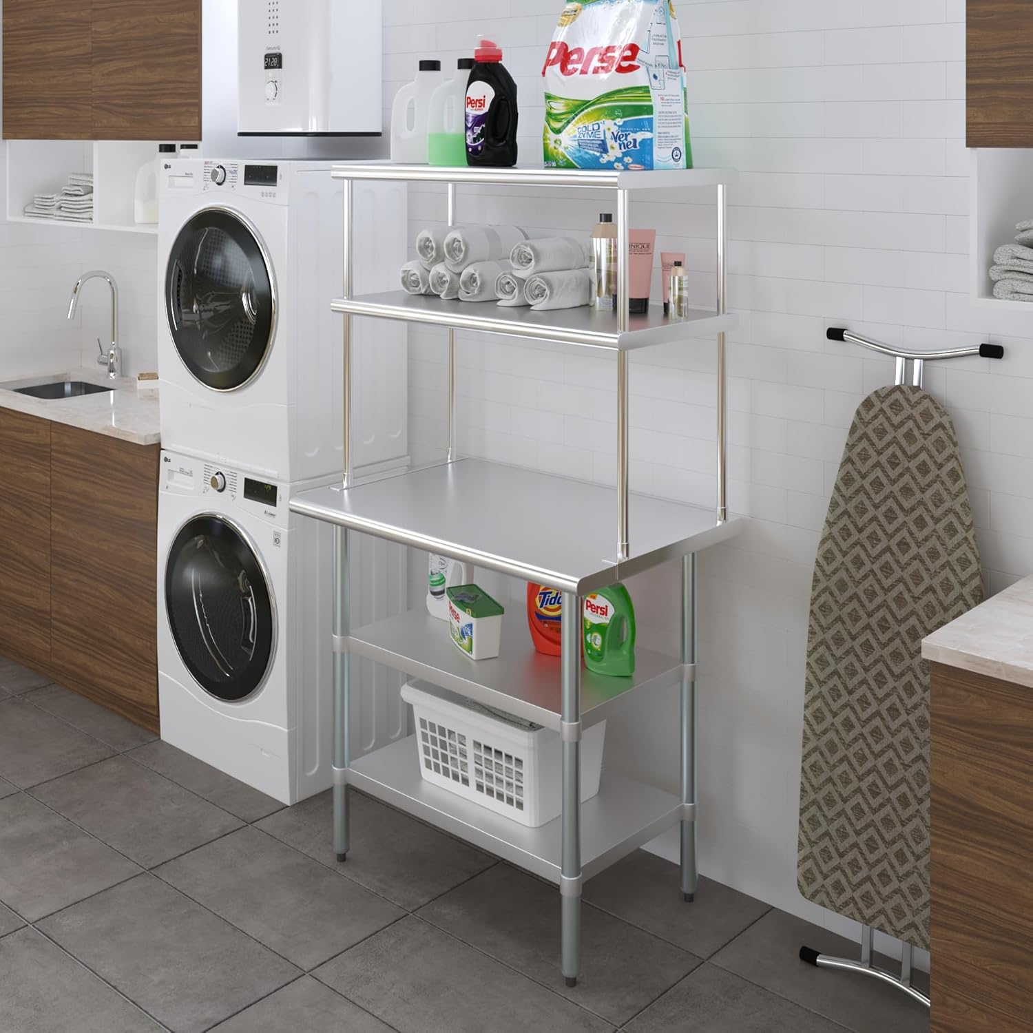 - WORK SAFETY: Work table top and double tier adjustable shelves are constructed from 18-gauge stainless steel, making this restaurant prep and serve table and double tier shelf combo set is durable and long lasting. The table top comes with a galvanized under-shelf for additional storage and adjustable legs for convenience. This table and shelf set is specifically designed and finished for use in a commercial or industrial setting, but is just as reliable in the home.