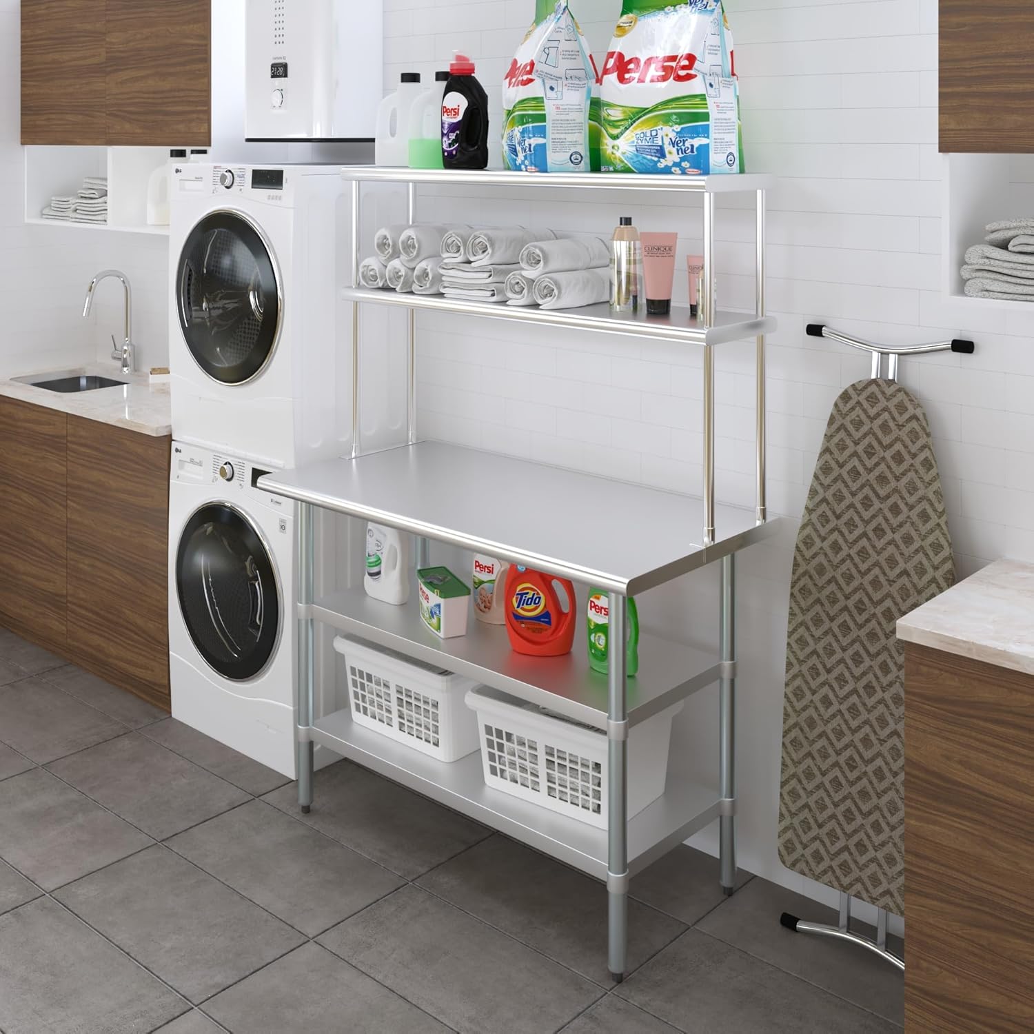 - WORK SAFETY: Work table top and double tier adjustable shelves are constructed from 18-gauge stainless steel, making this restaurant prep and serve table and double tier shelf combo set is durable and long lasting. The table top comes with a galvanized under-shelf for additional storage and adjustable legs for convenience. This table and shelf set is specifically designed and finished for use in a commercial or industrial setting, but is just as reliable in the home.