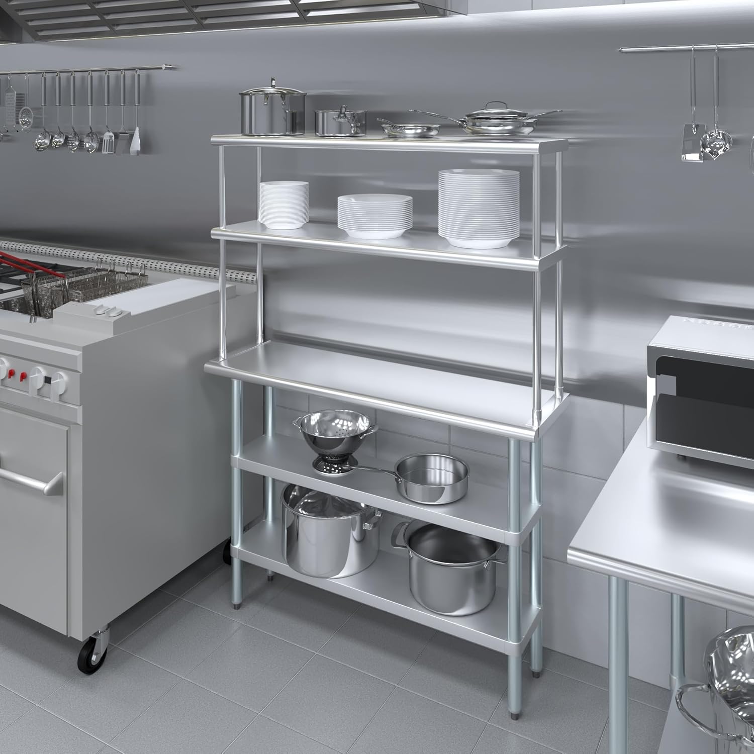 - WORK SAFETY: Work table top and double tier adjustable shelves are constructed from 18-gauge stainless steel, making this restaurant prep and serve table and double tier shelf combo set is durable and long lasting. The table top comes with a galvanized under-shelf for additional storage and adjustable legs for convenience. This table and shelf set is specifically designed and finished for use in a commercial or industrial setting, but is just as reliable in the home.