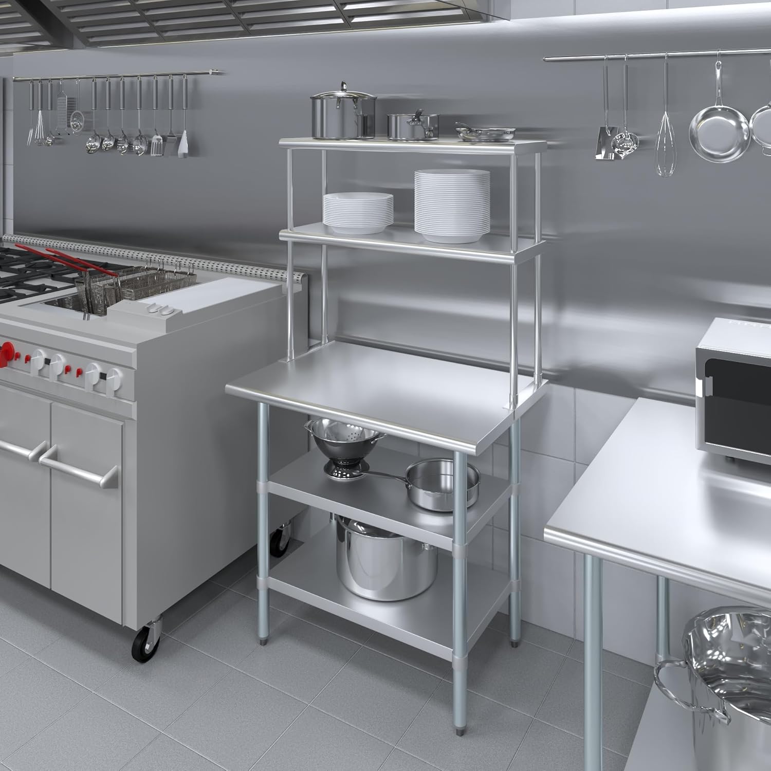 - WORK SAFETY: Work table top and double tier adjustable shelves are constructed from 18-gauge stainless steel, making this restaurant prep and serve table and double tier shelf combo set is durable and long lasting. The table top comes with a galvanized under-shelf for additional storage and adjustable legs for convenience. This table and shelf set is specifically designed and finished for use in a commercial or industrial setting, but is just as reliable in the home.