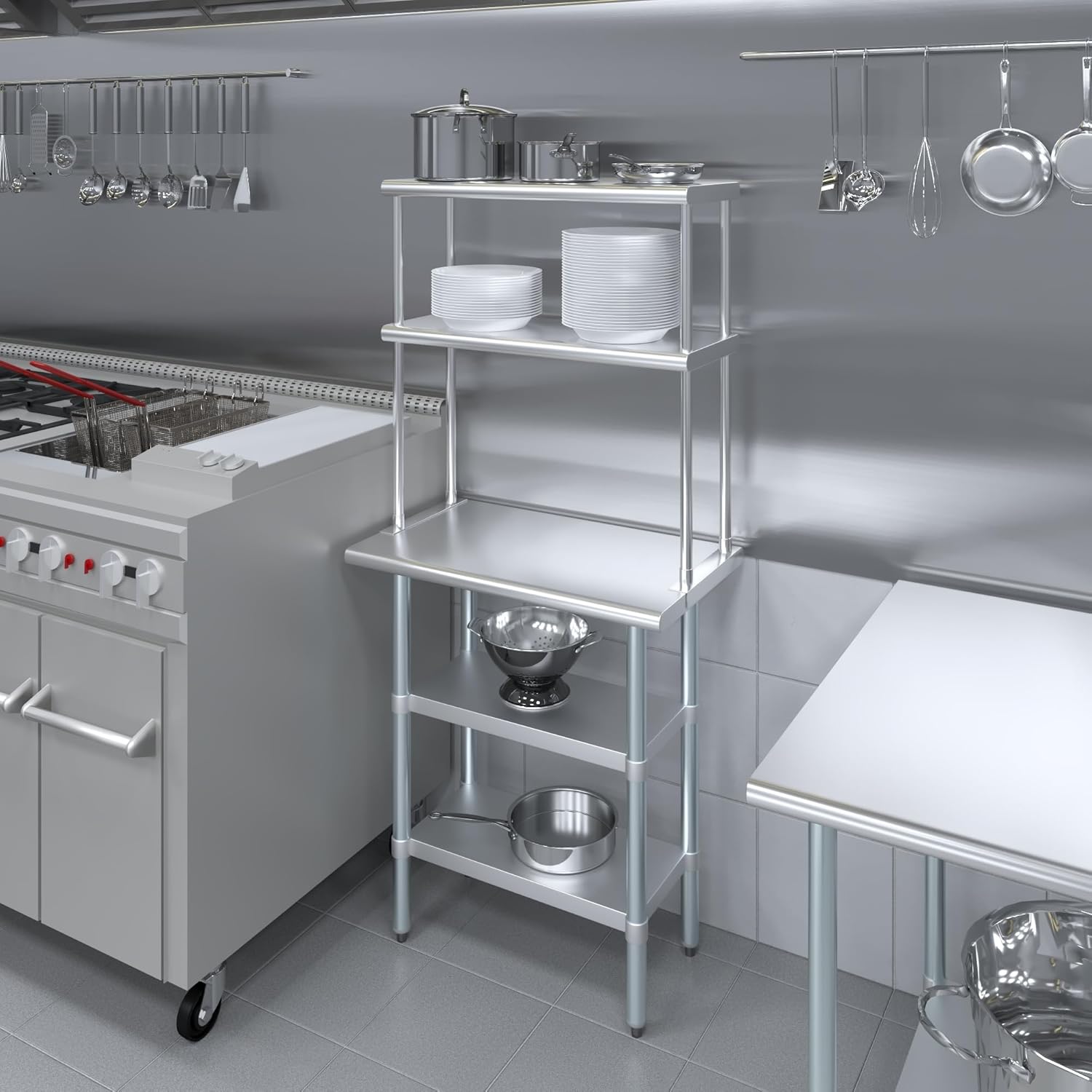 - WORK SAFETY: Work table top and double tier adjustable shelves are constructed from 18-gauge stainless steel, making this restaurant prep and serve table and double tier shelf combo set is durable and long lasting. The table top comes with a galvanized under-shelf for additional storage and adjustable legs for convenience. This table and shelf set is specifically designed and finished for use in a commercial or industrial setting, but is just as reliable in the home.