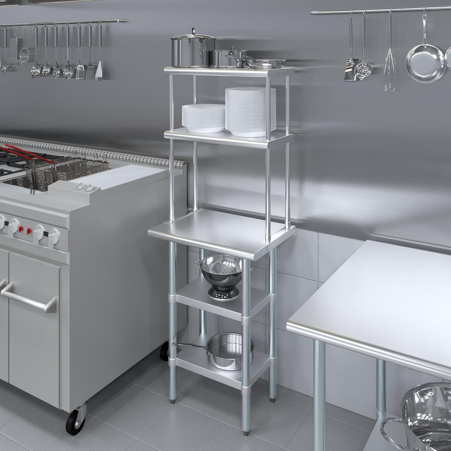 - WORK SAFETY: Work table top and double tier adjustable shelves are constructed from 18-gauge stainless steel, making this restaurant prep and serve table and double tier shelf combo set is durable and long lasting. The table top comes with a galvanized under-shelf for additional storage and adjustable legs for convenience. This table and shelf set is specifically designed and finished for use in a commercial or industrial setting, but is just as reliable in the home.