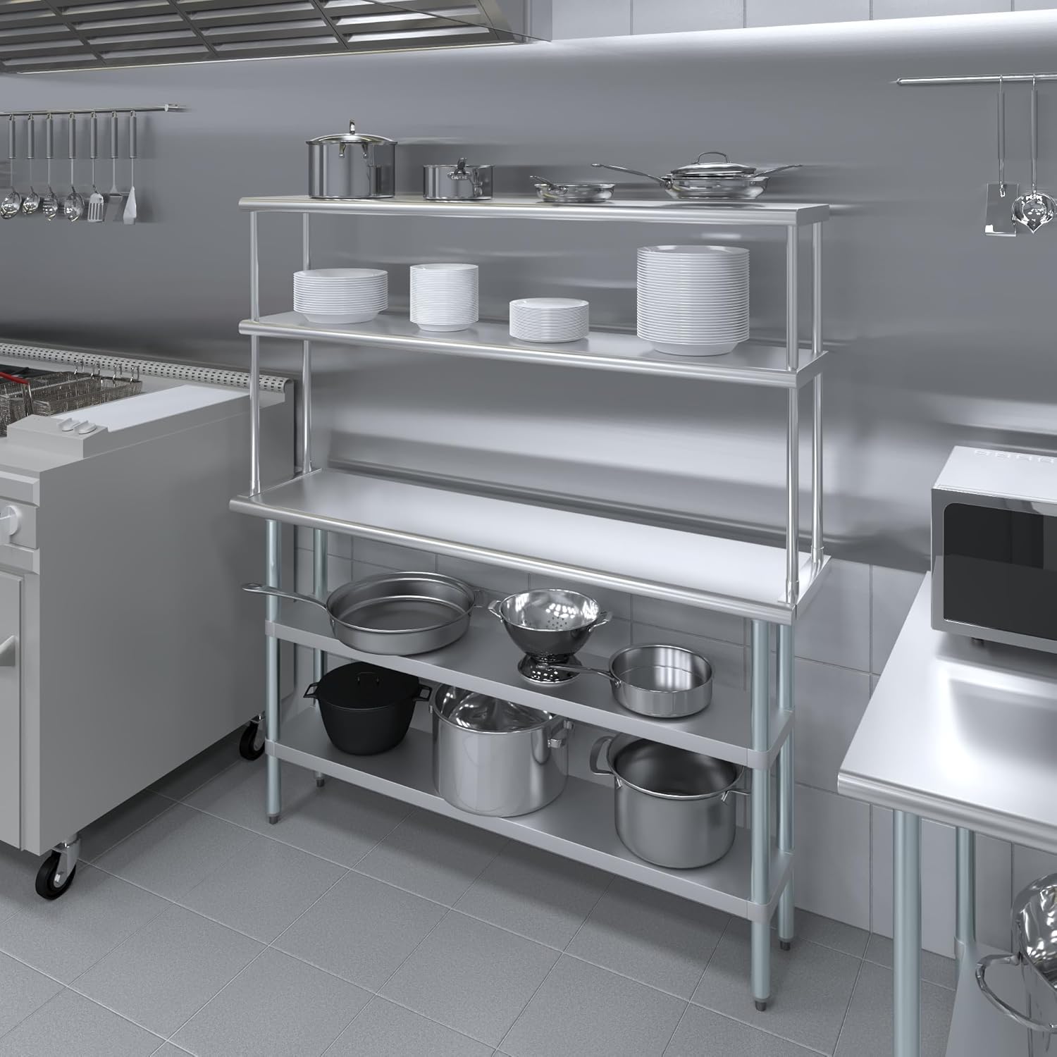- WORK SAFETY: Work table top and double tier adjustable shelves are constructed from 18-gauge stainless steel, making this restaurant prep and serve table and double tier shelf combo set is durable and long lasting. The table top comes with a galvanized under-shelf for additional storage and adjustable legs for convenience. This table and shelf set is specifically designed and finished for use in a commercial or industrial setting, but is just as reliable in the home.