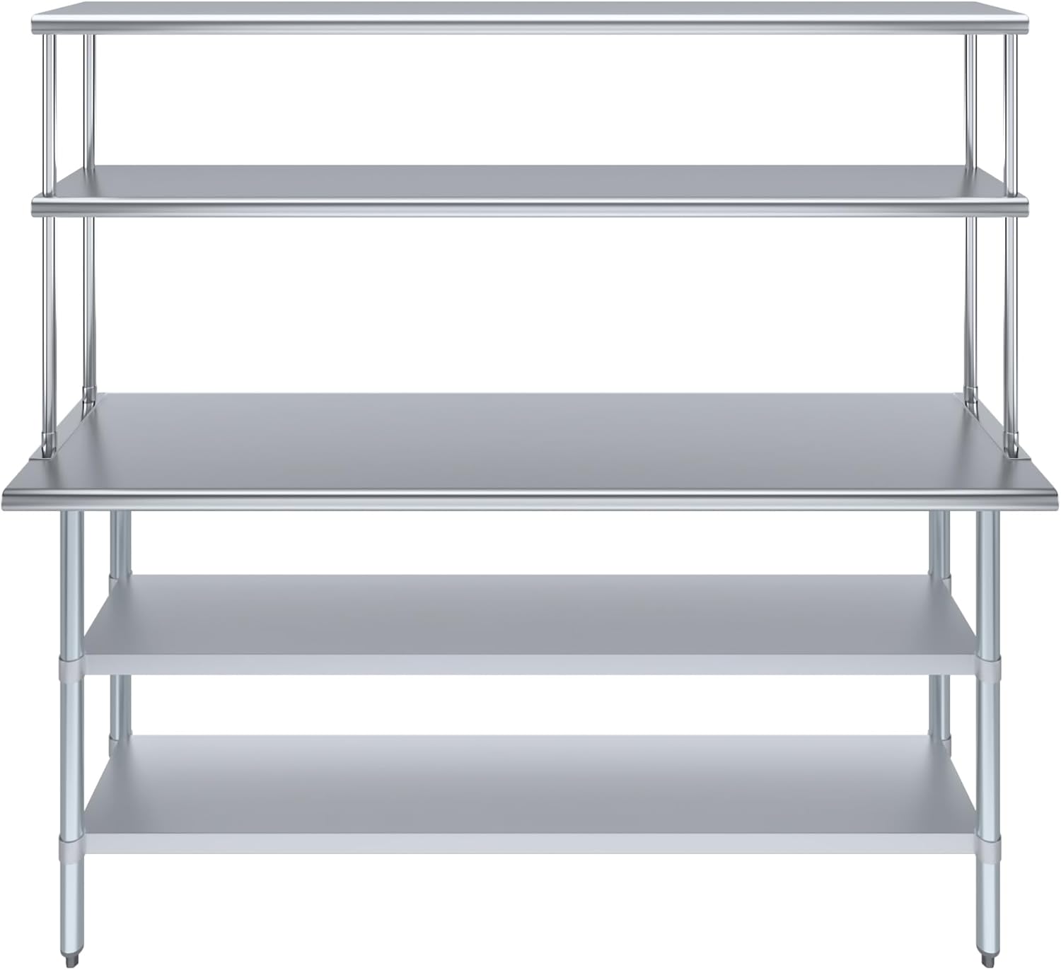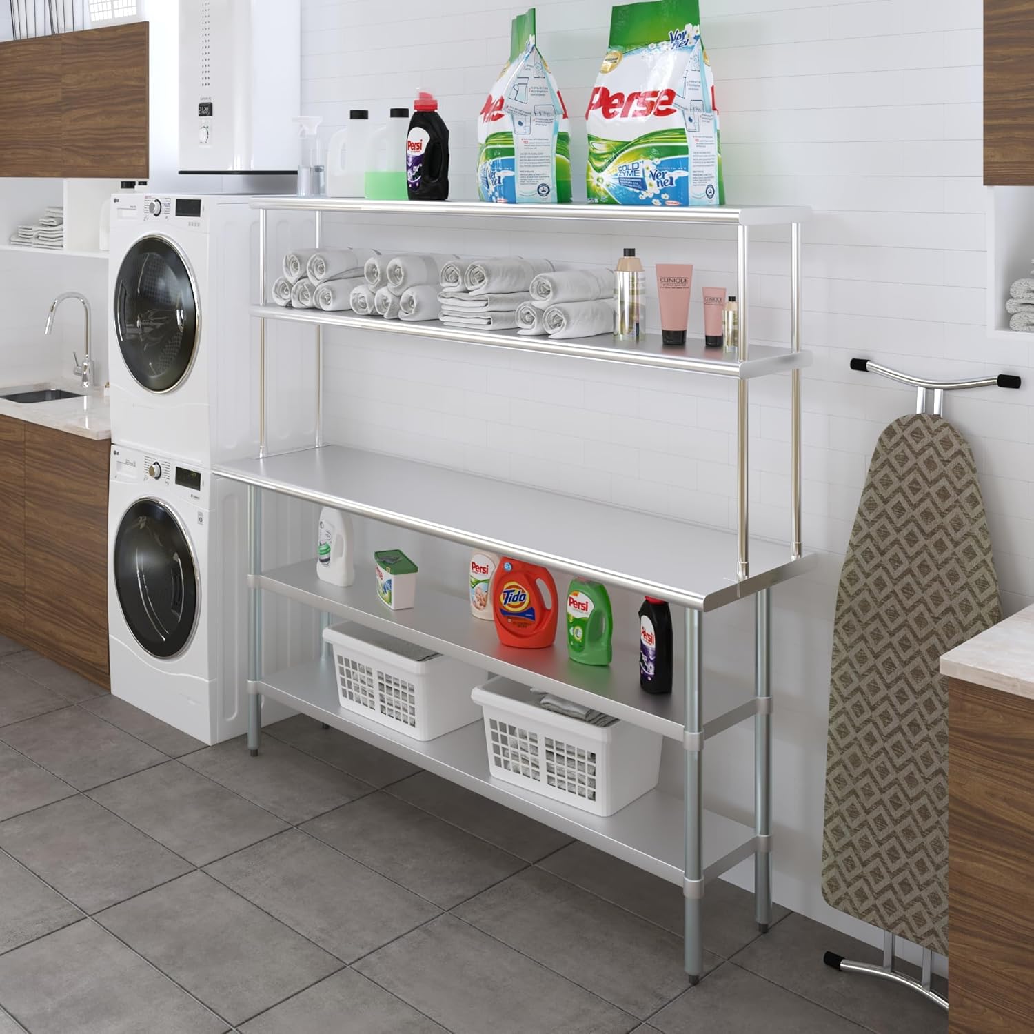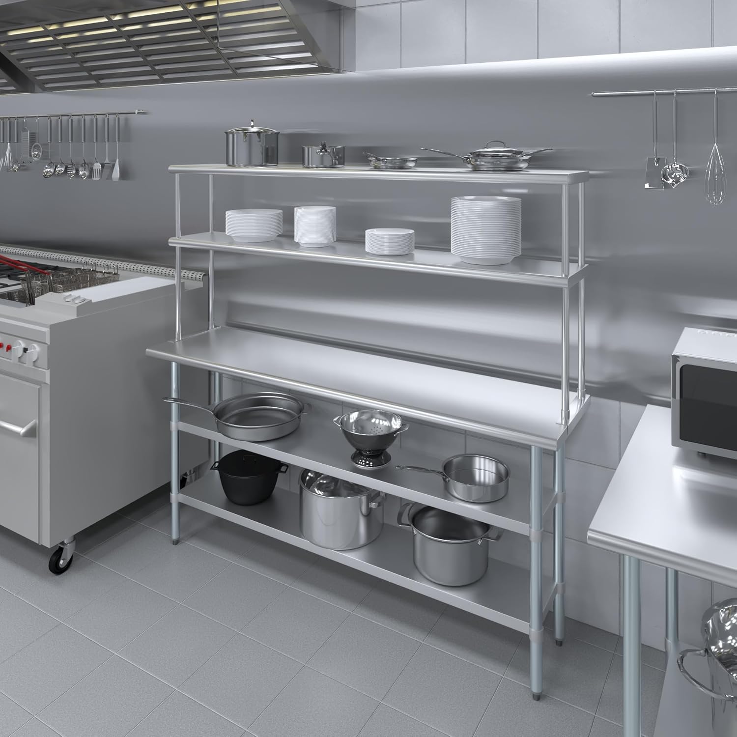 - WORK SAFETY: Work table top and double tier adjustable shelves are constructed from 18-gauge stainless steel, making this restaurant prep and serve table and double tier shelf combo set is durable and long lasting. The table top comes with a galvanized under-shelf for additional storage and adjustable legs for convenience. This table and shelf set is specifically designed and finished for use in a commercial or industrial setting, but is just as reliable in the home.