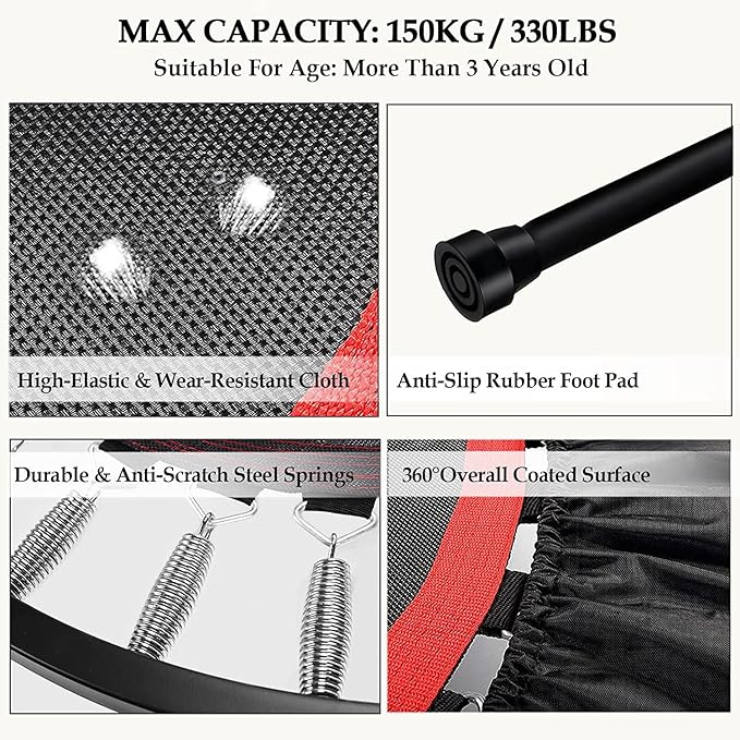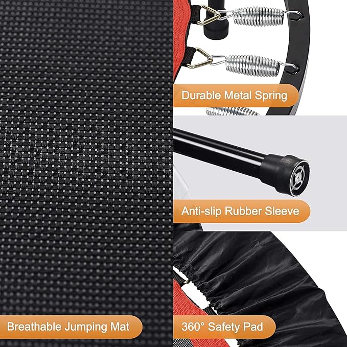 - ★DURABLE AND FUN: The trampoline folds up easily for easy storage and transport. With sturdy and anti-skid legs, the trampoline is great for both indoor and outdoor use.The sturdy anti-skid legs will prevent skid marks on your floor.