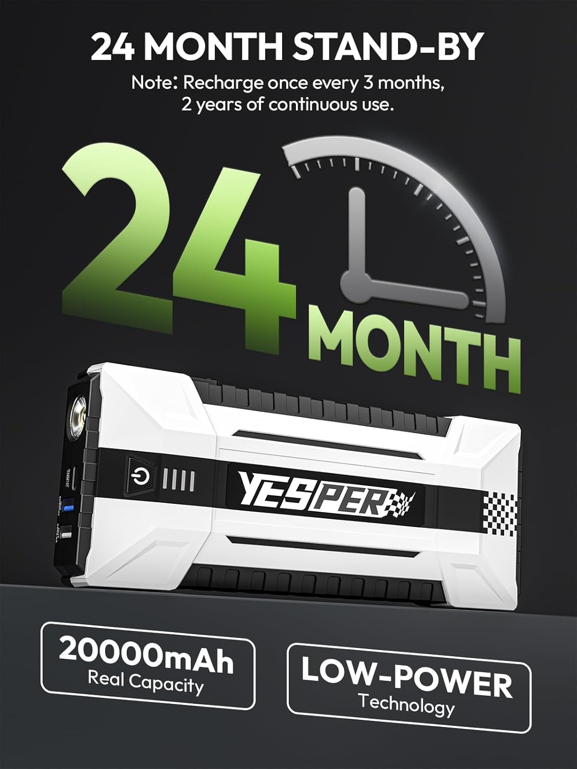 - Powerful Emergency Jump Starter -- YESPER YJS20 car battery jump starter with a peak current of 3000 amps is perfect for starting 12V vehicles such as cars, trucks, boats and large vehicles (up to 10L gasoline engines and 8L diesel engines); and equipped with a powerful 20000mAh battery, it can achieve 50 quick starts and can work properly even in extreme climate conditions from -4 to 140Β°F