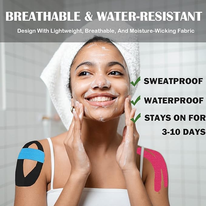 - ✔BREATHABLE & SKIN FRIENDLY - Designed with lightweight, breathable, and moisture-wicking fabric to minimize the possibility of skin irritation, itching and blisters.It’s also water and sweat proof,no matter what you do, this kinesiology sports tape stays put for several days without irritating your skin or leaving behind a sticky residue.