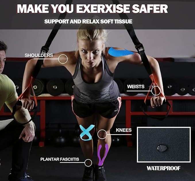 - ✔BREATHABLE & SKIN FRIENDLY - Designed with lightweight, breathable, and moisture-wicking fabric to minimize the possibility of skin irritation, itching and blisters.It’s also water and sweat proof,no matter what you do, this kinesiology sports tape stays put for several days without irritating your skin or leaving behind a sticky residue.