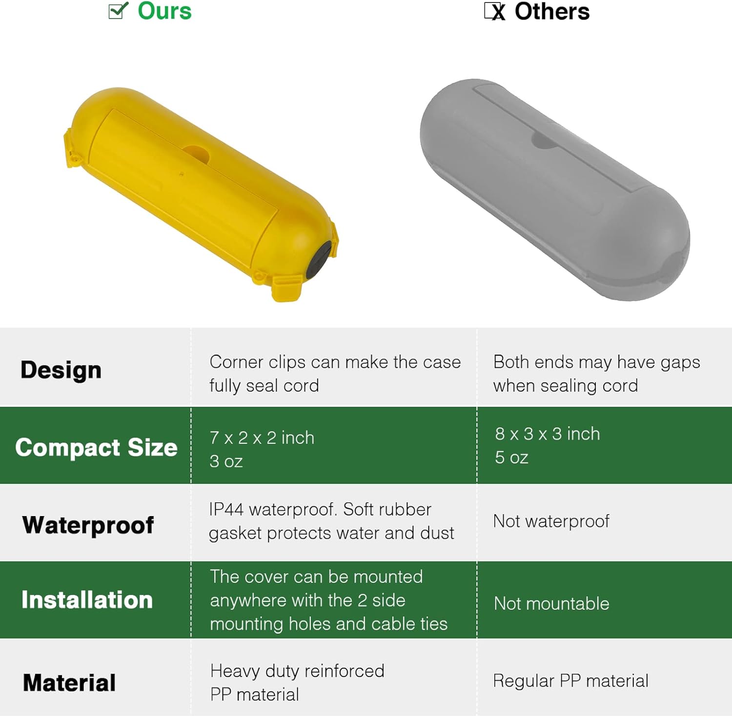 - With the 4 corner clips, snap-lock lid, and rubber gaskets, this outdoor extension cord cover box is IP44 waterproof. Perfect to seal 14/16/18 gauge cord, braided cable and flat wire.