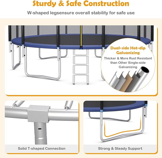 - Sturdy & Durable Construction: The trampoline for children and adults is crafted with galvanized steel frame, which is characterized by great rust resistance and durability. Foam covered on the frame can effectively prevent corrosion to ensure long-term outdoor use. Moreover, the legs strongly support the trampoline to make you jump in a more stable condition.