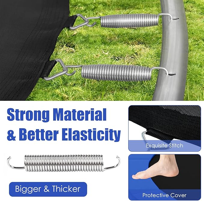 - Easy Installation & Convenient Use: With the installation manual included in the package, you can assemble the trampoline effortlessly. We provide you with six different options (8/ 10/ 12/ 14/ 15/ 16 FT with 42/ 54/ 72/ 80/ 90/ 108 PCS high-extension and rust resistant springs) for choice to satisfy various requirements. Besides, the ladder is equipped with a 2-step ladder for easy access to inner space.