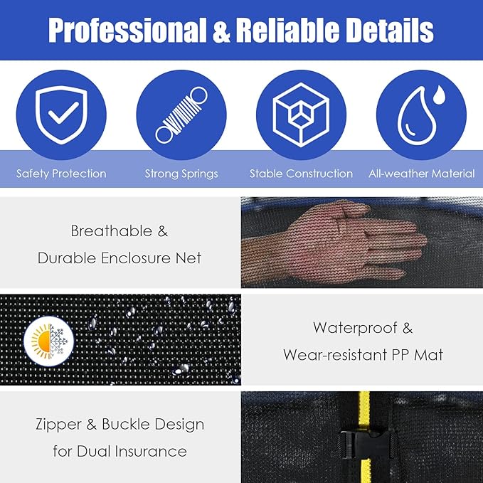 - 360-Degree Enclosure Net w/ Buckle & Zipper: The trampoline features the 6 FT high all-round enclosure net, which is UV, fade resistant and tear-resistant. Combined with the buckle and zipper double lock system, it adds additional safety for jumping.