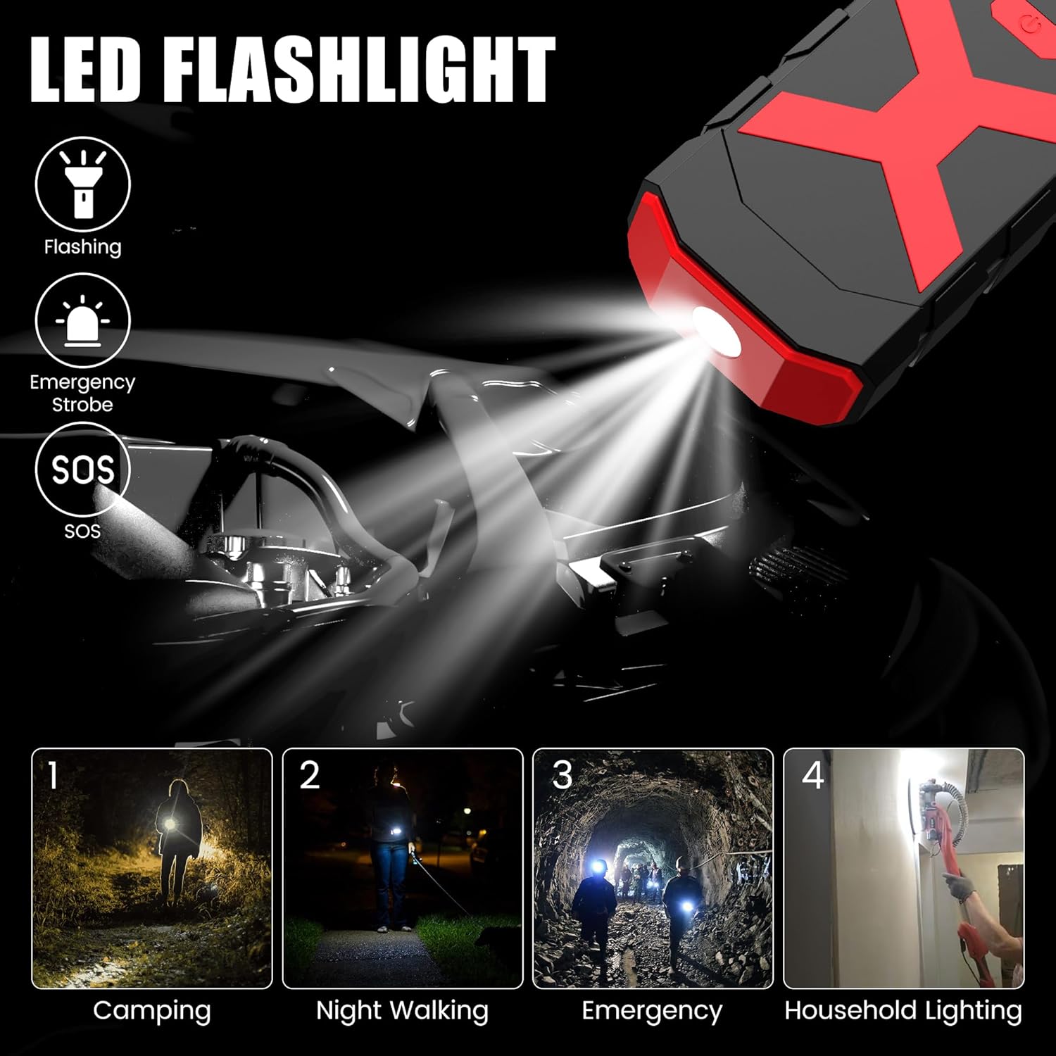 - ăMULTI FUNCATION JUMP BOXă - Not just a jump box, it has 3 LED lights modes: Flash Light, Strobe Light, and SOS Light. This multi-purpose flashlight comes in handy in case of picnic, travel, emergency and outdoor adventures; 400 LM 5W LED can work more than 10 hours,weather you take it for reading or for help