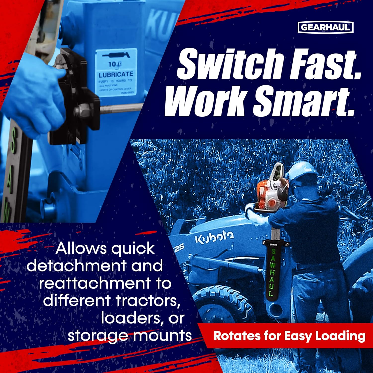 - EASY TRANSFER BETWEEN DIFFERENT EQUIPMENT. GearHaul’s Snap-Lok Rotating Chainsaw Mount for Tractors allows quick detachment and reattachment to different mobile machinery equipped with Snap-Lok Base mounts. The rotating feature provides effortless access to your chainsaw, reducing strain and improving workflow efficiency.