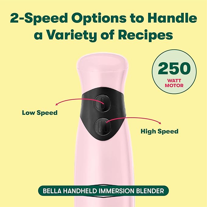 BELLA Immersion Hand Blender, Portable Mixer with Whisk Attachment - Electric Handheld Juicer, Shakes, Baby Food and Smoothie Maker, Stainless Steel, Pink
