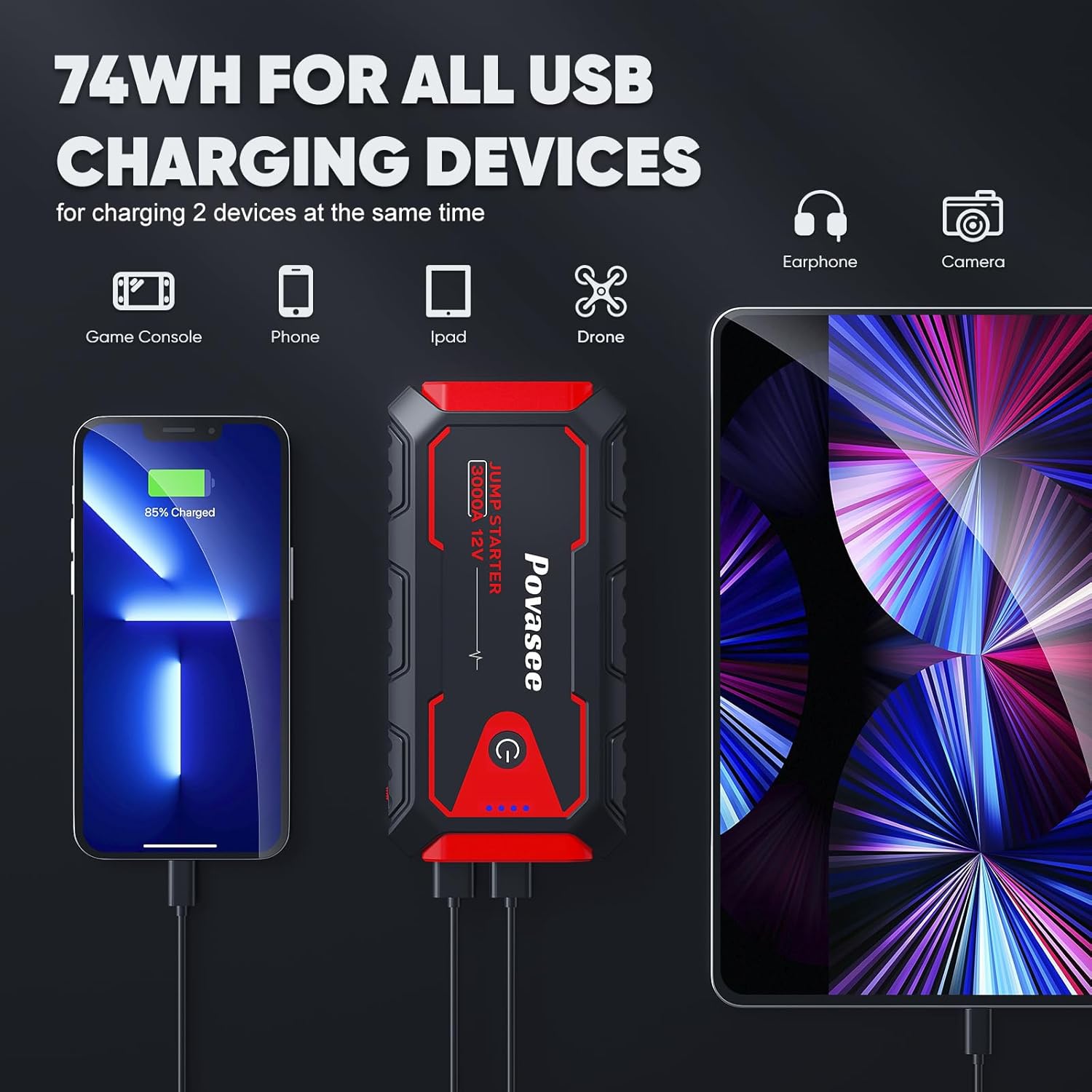 - 【3000A Car battery jump starter】: With Povasee 3000A jump starter can jump start 10L GAS/8.0L DIESEL engines within seconds. Even if the battery voltage is too low (below 9V), pressing the “RST” button will help the engine to restart.About 60 quick jump starts on a single charge. Suitable for 12V passenger cars, trucks, motorcycles, boats,tractor etc.