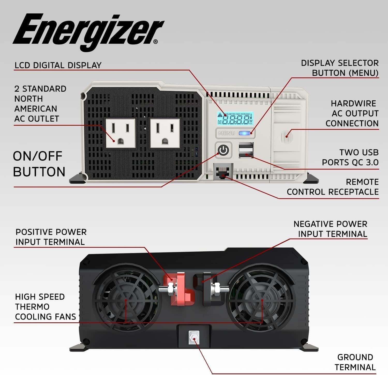 - ENERGIZER PURE SINE POWER INVERTER- 1500 watts continuous pure sine power, 3000 watts peak power, EP1500 pure sine wave power inverter converts 12V DC to 120V AC power, connect DC battery cables directly to your 12V battery and you have power on the go.