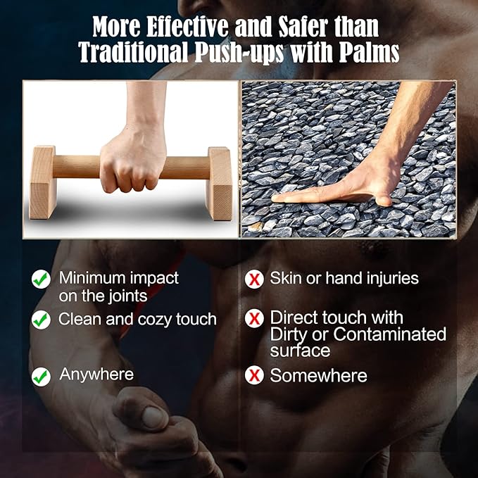 - Stable & Durable Design: Push up bars is crafted from premium solid beech wood; Non-slip rubber base enhances workout stability; Protects hardwood floors from scratches