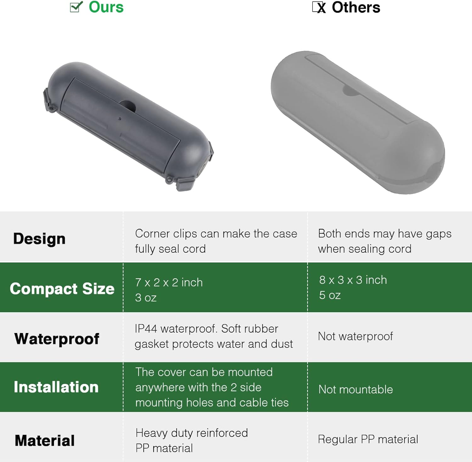 - Made with heavy-duty reinforced PP material to withstand rain, snow, water, dust, dirt and more, continuously protecting outdoor connections from electrical hazard.