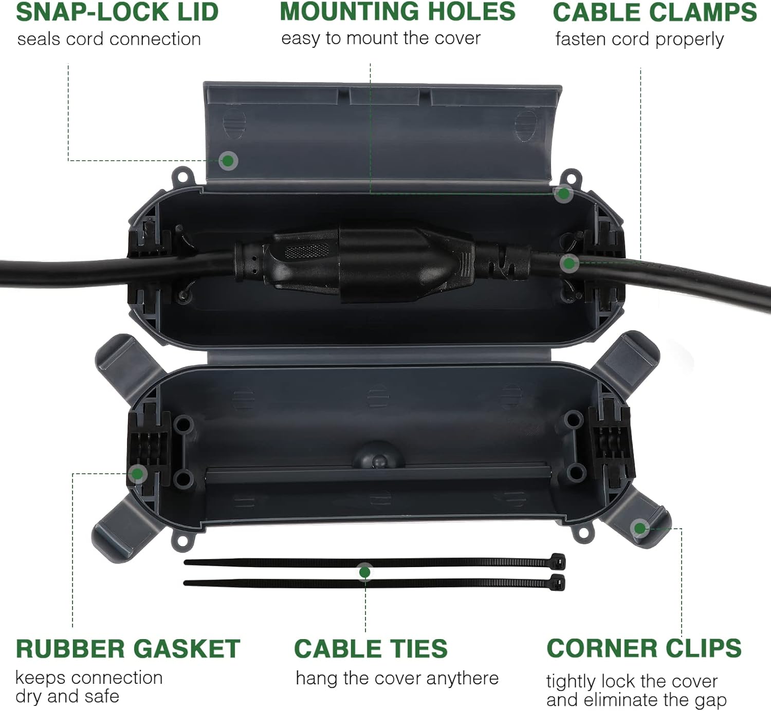 - With the 4 corner clips, snap-lock lid, and rubber gaskets, this outdoor extension cord cover box is IP44 waterproof. Perfect to seal 14/16/18 gauge cord, braided cable and flat wire.