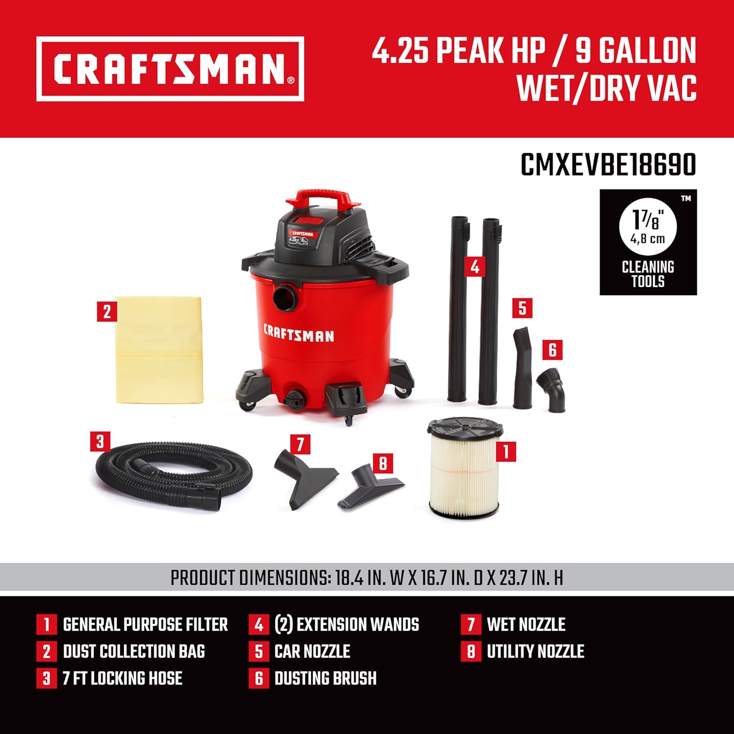 CRAFTSMAN CMXEVBE18690 9 Gallon 4.25 Peak HP Wet Dry Vac, Portable Shop Vacuum Wet and Dry with Filter, Dust Bag, Dusting Brush, Hose and Attachments for Home, Garage and Automotive Cleaning