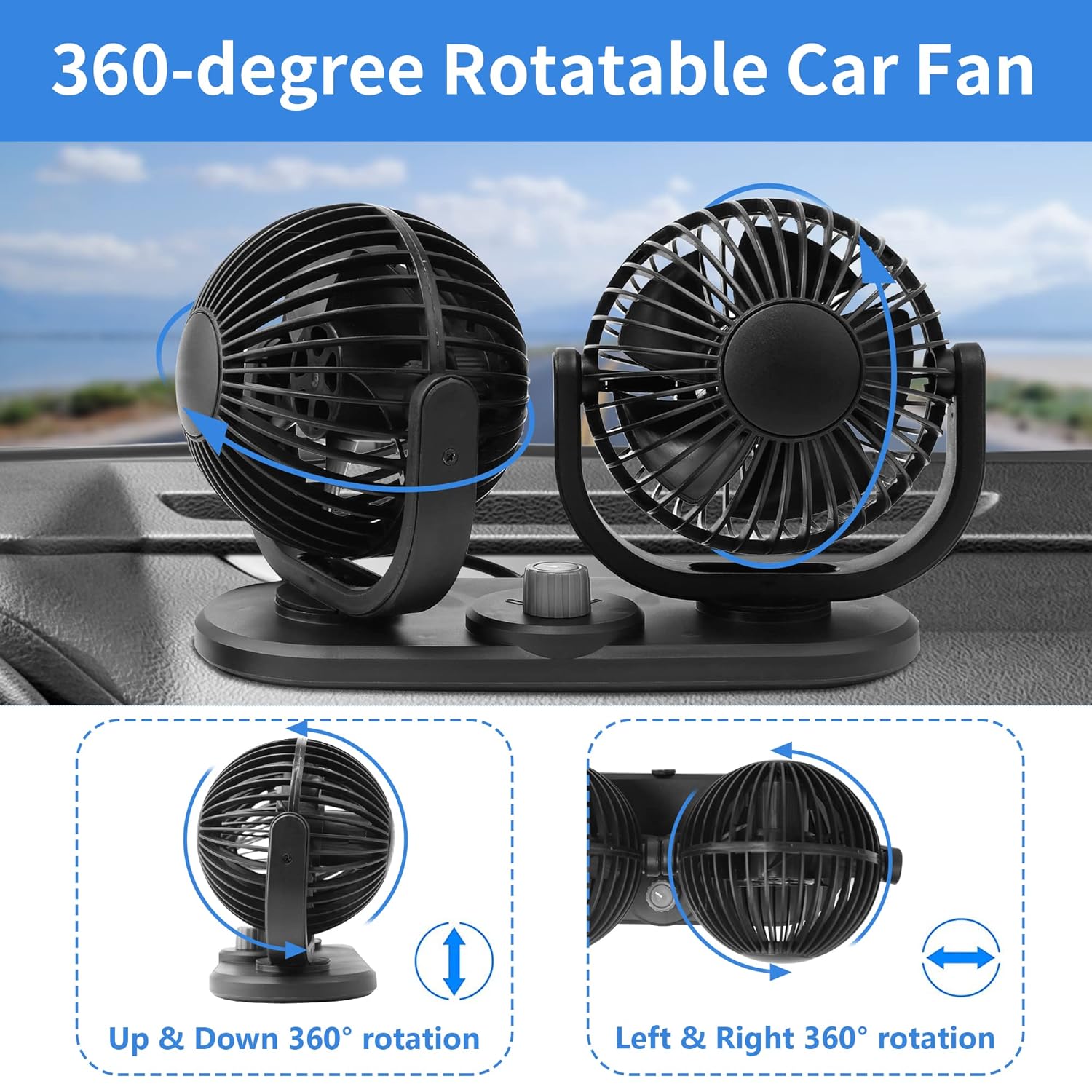 - ❄【Power Wind & Low Noise】Low energy consumption, low noise.blowing hot air out of parking car immediately with this 12 volt fan ,with 2 rotatable fan heads and 2 setting speeds,bringing power cool air for your family or pet in the rear seat.