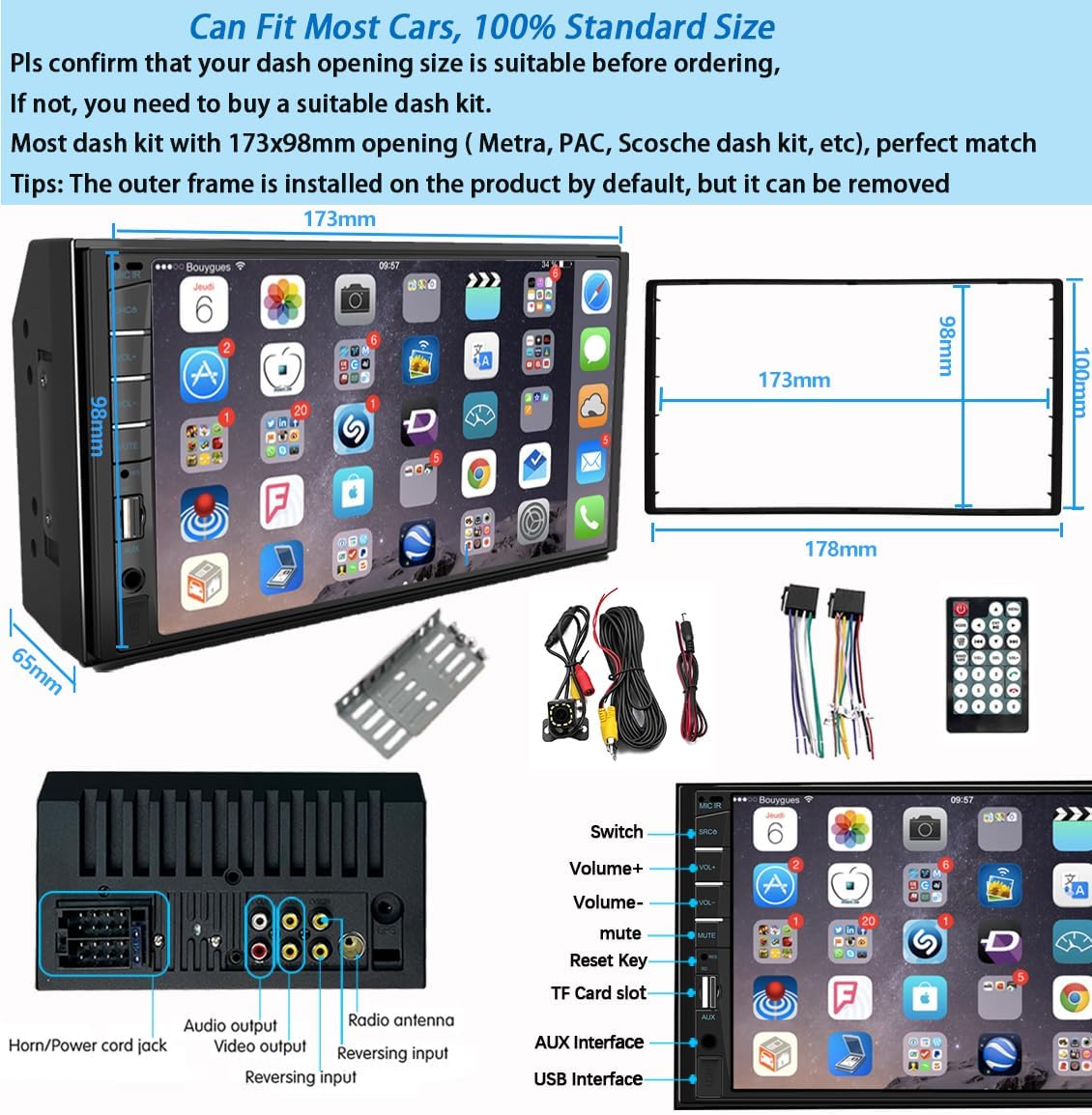 - ăDouble Din Car Stereo with Backup CameraăThe Car Audio Receiver supports the rear view and will display the image automatically when the vehicle shifts into reverse. HD night vision rear view camera is included, ultra-wide viewing angle of 170 ° and a fully waterproof design, helps to park more safely and easily.