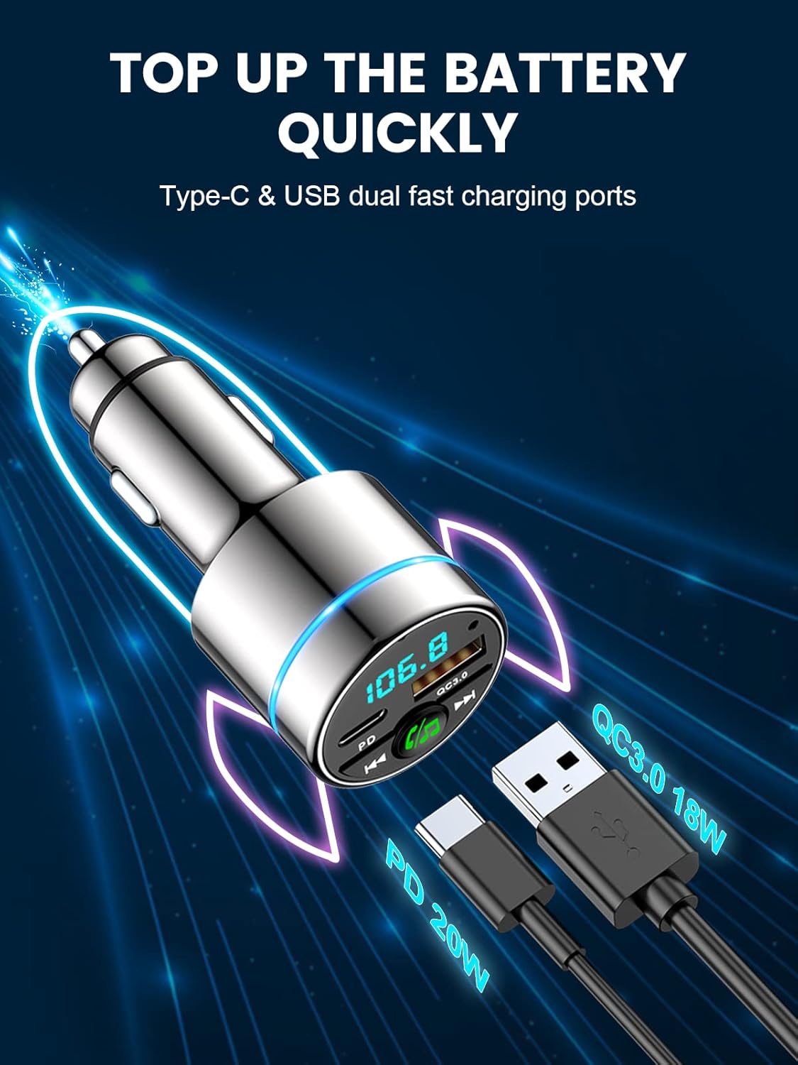 FM Transmitter for Car Bluetooth 5.3, All-Metal PD 20W & QC3.0 18W Fast Charger, Wireless FM Radio Car Kit Bluetooth Adapter, Noise Cancelling Hands-Free Call, Hi-Fi Music, Ring Light