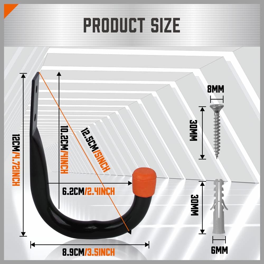 • 6 pack garage storage hooks with 12pcs screws and anchors, hook size: 4.72in x 3.5in(L x W).
