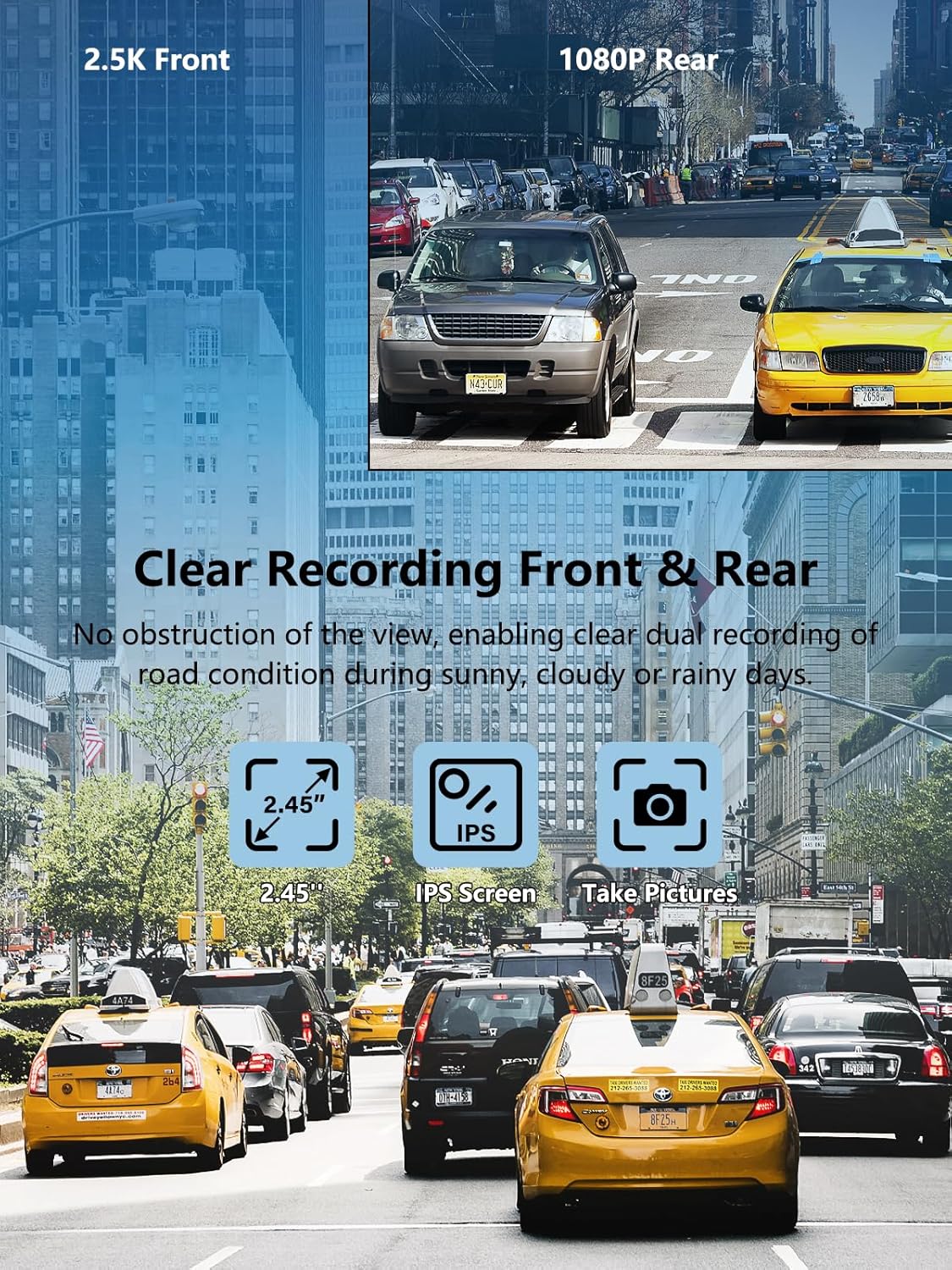 - 2.5K MINI DASH CAM FRONT AND REAR - โญThe NEW VERSION has been updated since January 25, 2025. The resolution has been upgraded for a better experience. It comes with a 170 wide-angle 2.5K front camera and a 1080P HD waterproof rear camera that captures all three lanes of the road. This mini and compact dash cam won't obscure your view. Meanwhile, the IPS display and WDR function make video recording more vivid, colorful and clear.