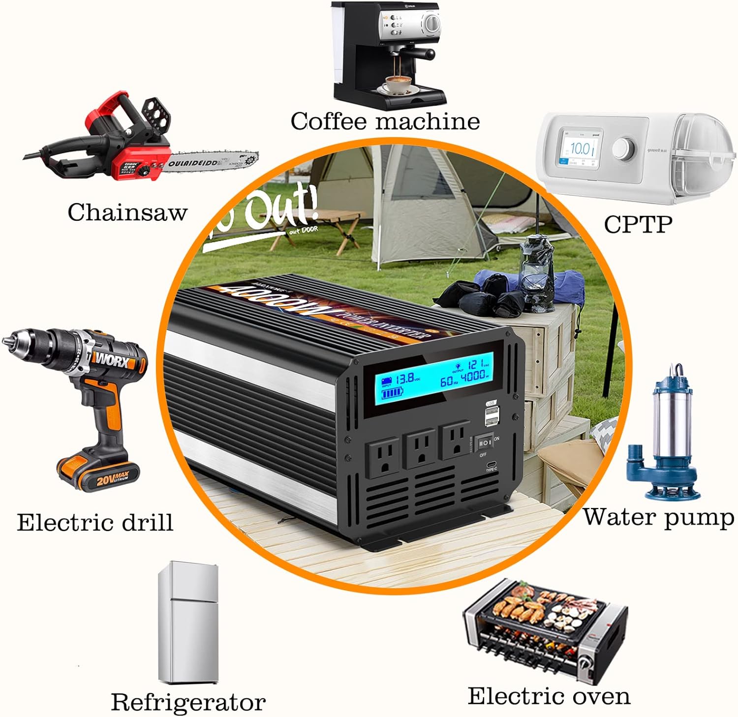 - โ This is a 12 volt 4000 watt modified wave inverter that converts DC 12v to AC 110V/120V. Perfect for traveling, camping, tents, boat trips, working on the road, and anywhere without electricity! Just connect the power inverter to the battery and then to the device.