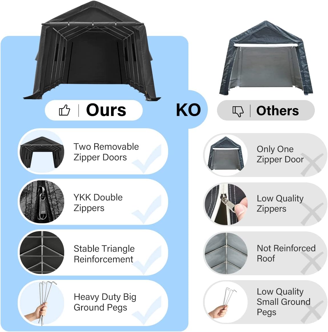 - 【Heavy Duty Durable Frame】✔1-1/2-inch diameter steel poles provide stability and strength to make the storage shelter carport safer. The garage storage tent is equipped with upgraded 0.32X11.81 inch (8X300mm) L-Type pegs, thickened and enlarged to increase stability.