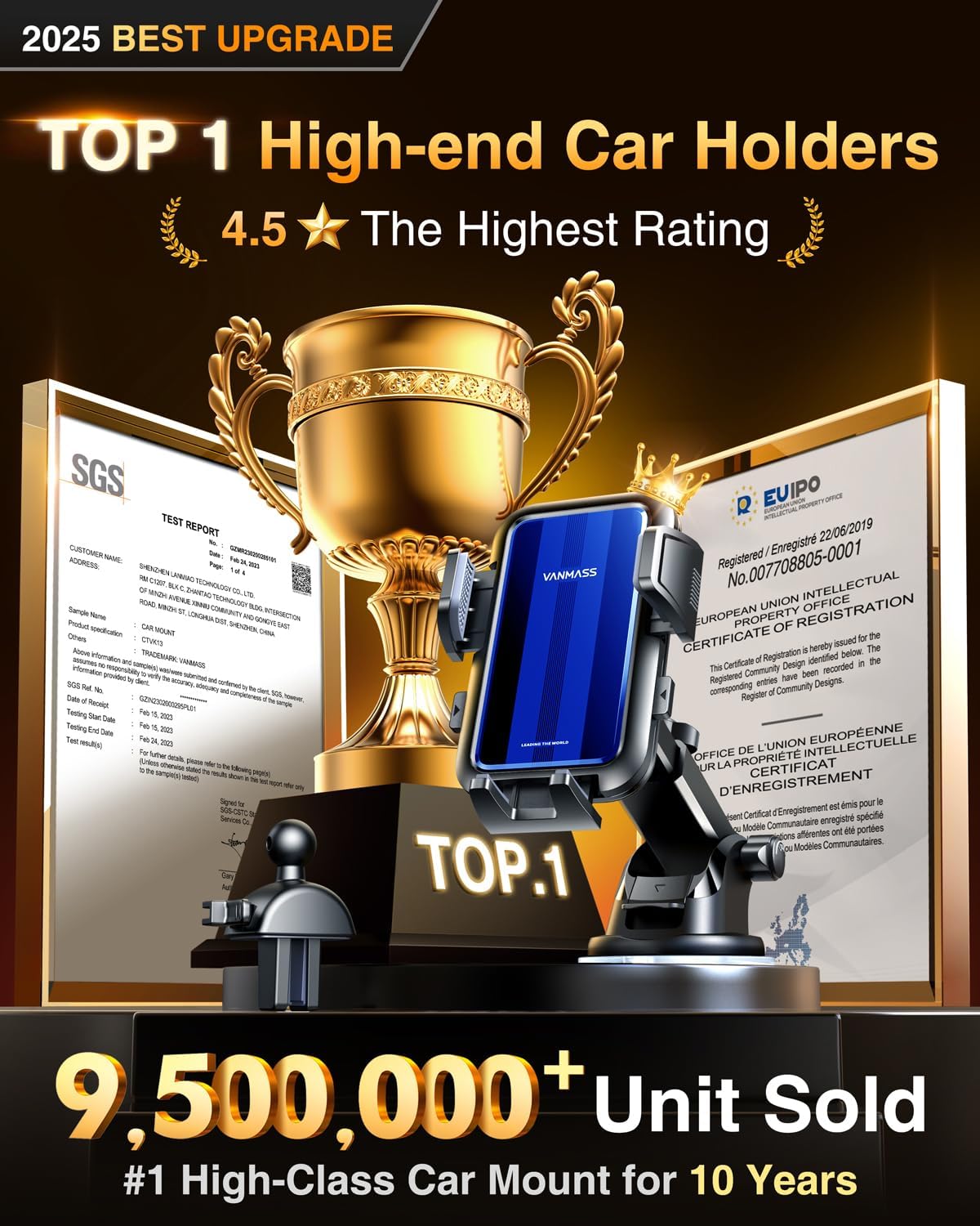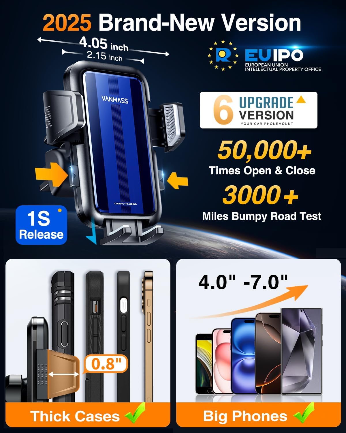 - 【VANMASS Leading the standard】Through 8 years of technical expertise, We use the best designs, and leading materials with world-first-class standards & tests to build this car phone cradle that lives at least 5 years. The Ultra Stable suction cup, anti-live heat & cold material, Smoothest One-Click Release, Upgraded Mirror Panel, and deeper Clamp Arm for Most Compatibility and protection. Make it the most preferred car mount in the class.