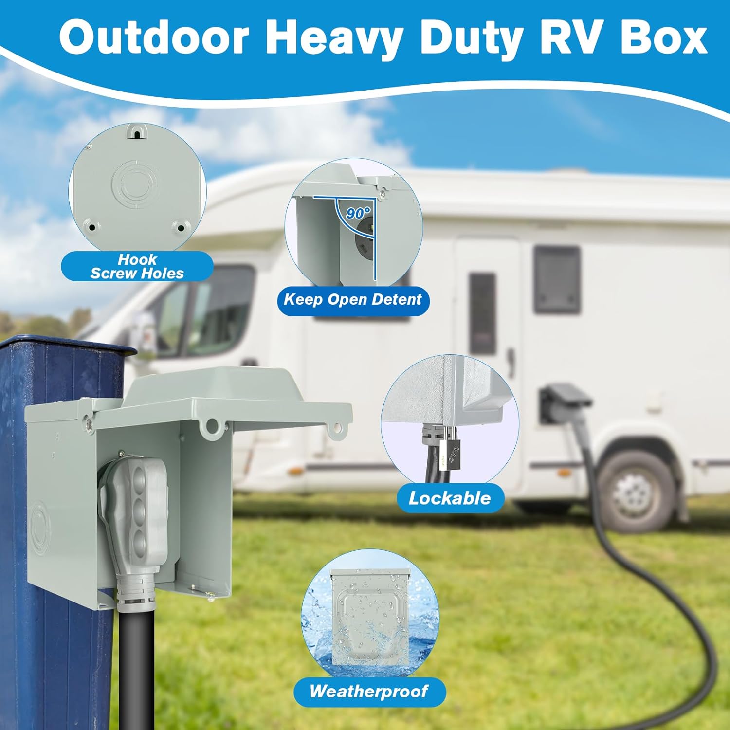 - 【ENOUGH SPACE】Our 30 Amp RV outlet box allows working with a large handle RV plug or 6 gauge wire, which can close the lid over an inserted cable.