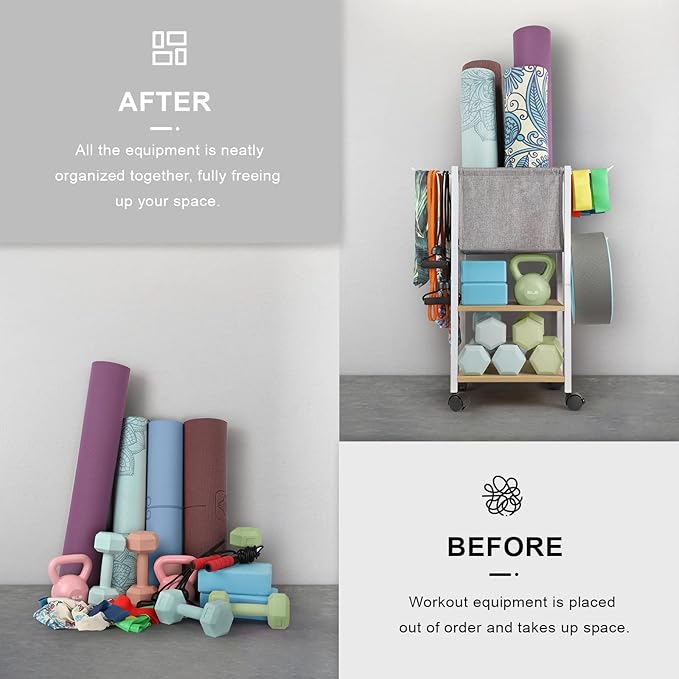 - 【Store Various Exercise Equipment】The fitness equipment storage rack combines yoga storage basket, home gym organizer shelf stand and resistance bands hanger. It can store yoga mats, foam rollers, yoga bolsters, small exercise balls, yoga blocks, dumbbells, kettlebells, resistance bands, yoga straps, pilates bars, jump ropes, yoga wheel, weighted hula hoops, water bottles, yoga towels and more gym equipment.