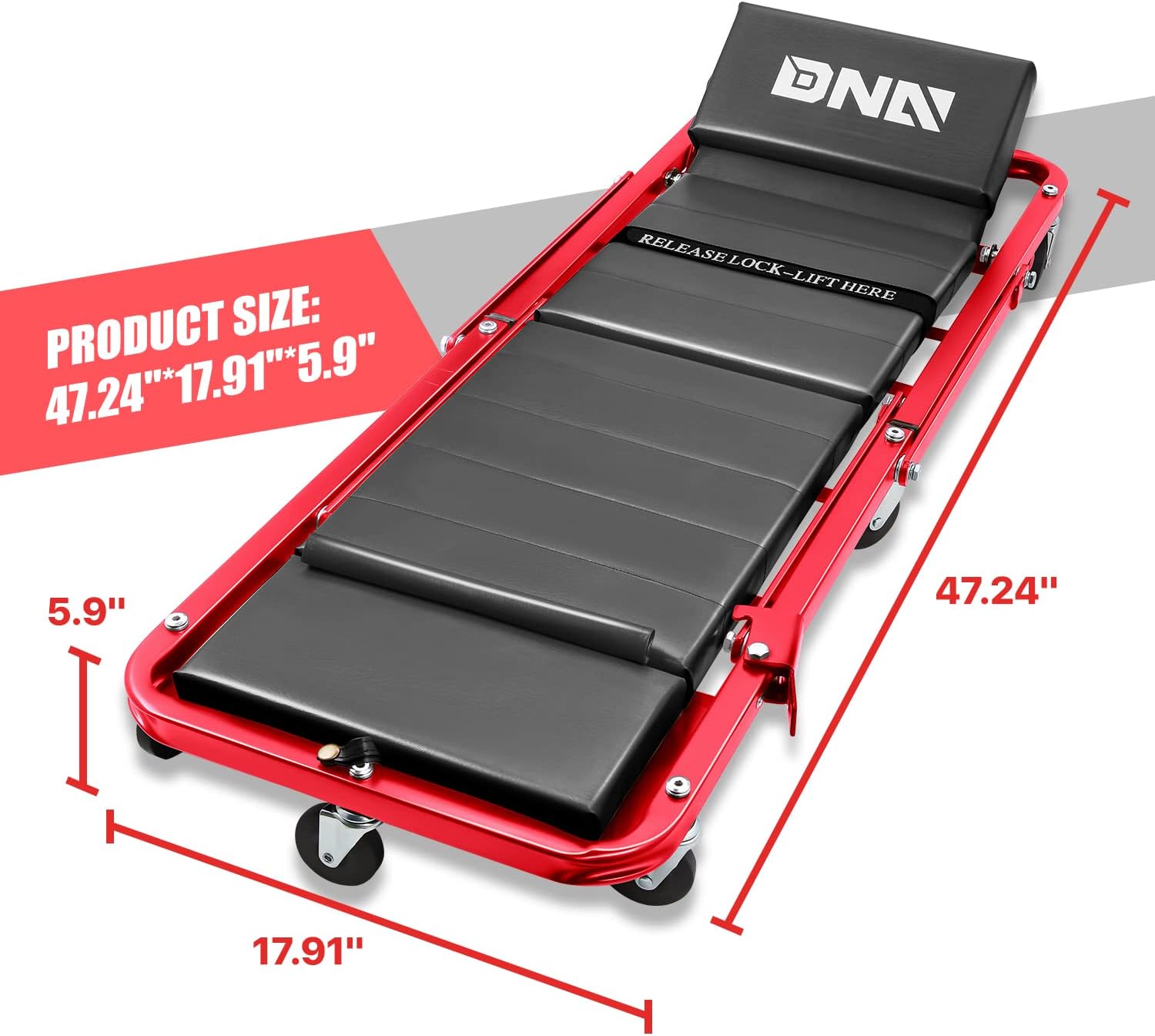 - WORK EASIER - Designed with 7 X 2" diameter swivel casters which deliver smooth and precise movements around your garage, making work routine take less time. And it features a fully padded bench for your back and headrest for added cushioning.