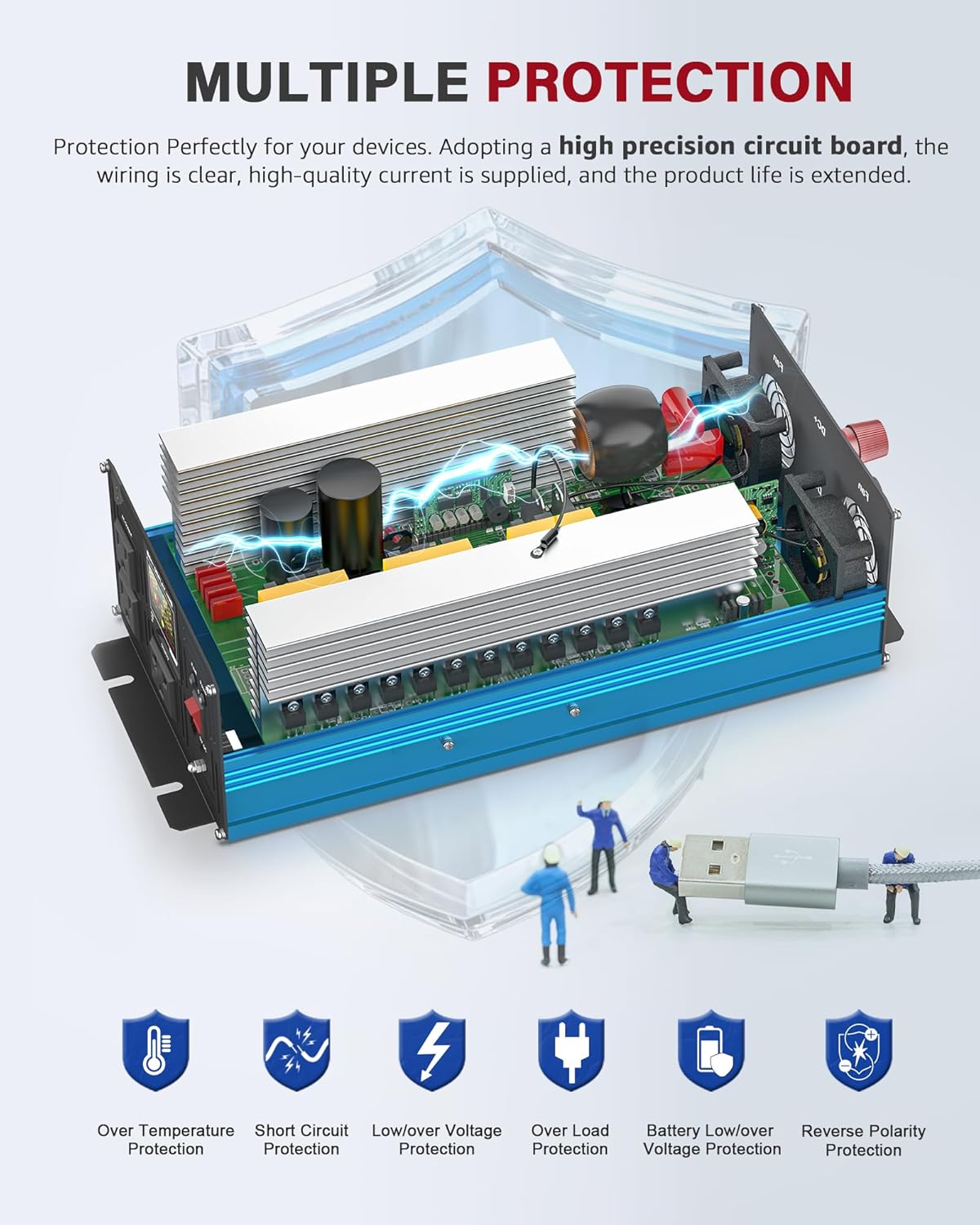 - 【PURE SINE WAVE & LOW ENERGY COMSUMPTION】 LCYMW high-quality 3000 watt inverter is a pure sine wave inverter with 2 AC outlets,1 2.4A USB ports, hard wiring terminals, which is suitable for most household and car appliances. The pure sine wave power inverter has higher conversion efficiency and greatly reduces the conversion consumption,the inverter output efficiency can be up to 90%.