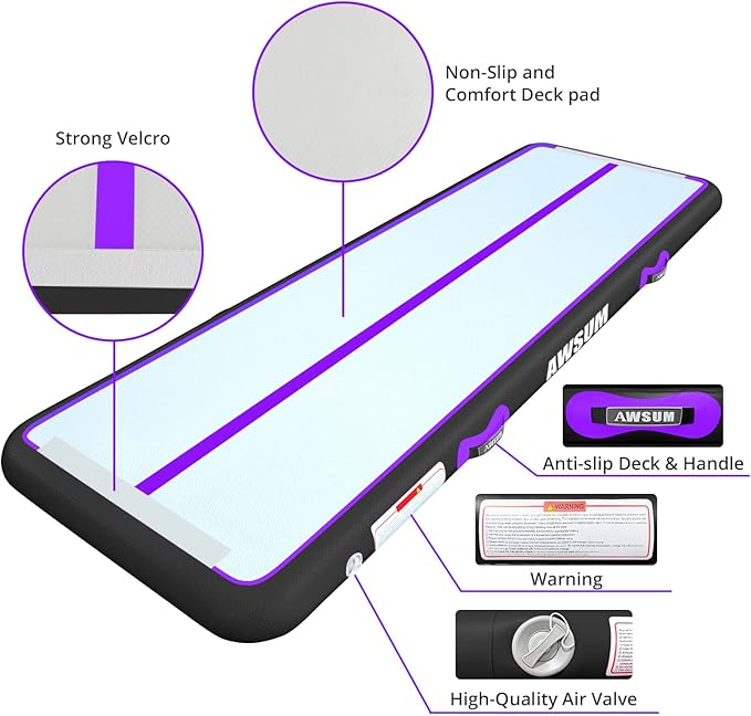 - Professional Tumbling Mat: AWSUM Air mats is made of high-quality PVC tarpaulin. All seams are made by handwork. Gymnastic mat Outer layer of mat is made of double-layer waterproof tarpaulin, better water-resistance. Tumble mat Inside is made of V-drop stitch technology, better flexibility