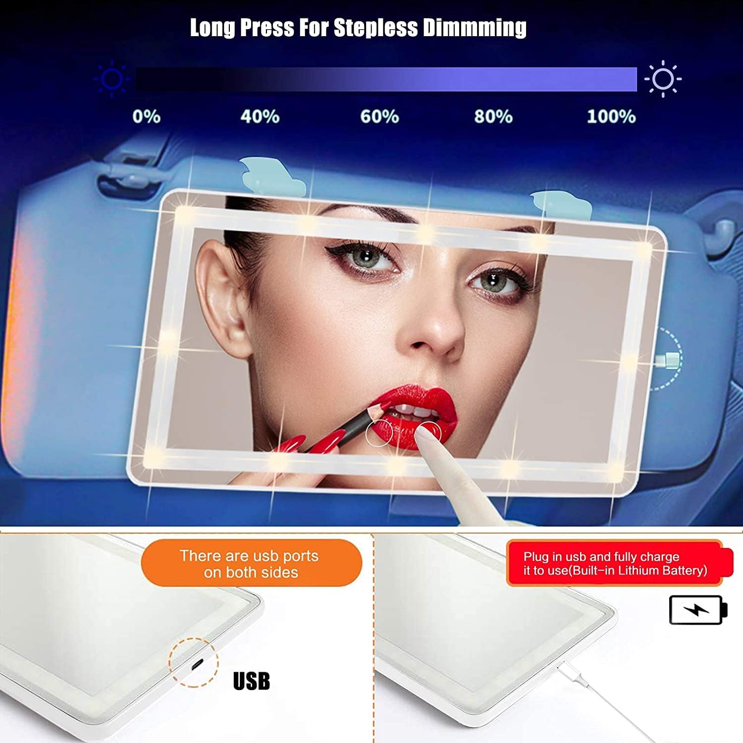 - 【USB POWER SUPPLY AND BUILT-IN LITHIUM BATTERY】-The car mirror is powered by lithium battery or USB cable, which can be charged through the socket, computer, mobile power, free to use the vanity mirror with lights at anywhere and anytime. 1800 mAh rechargable battery we used You could use it for 8 hours without charging it, Calculated by using 30 mins per day, the lithium battery can be used for at least 10 days with one charge.
