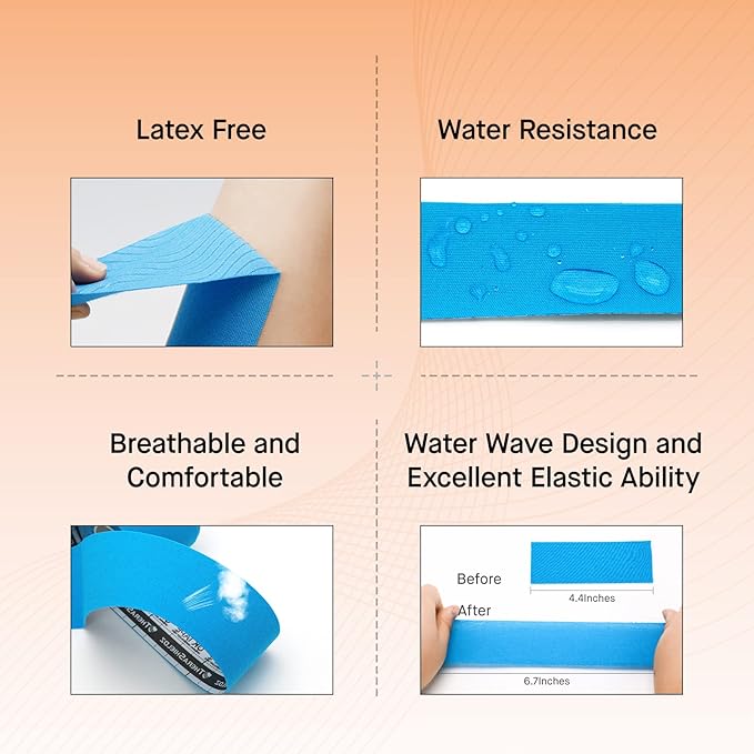 - SKIN FRIENDLY AND LATEX FREE - OK TAPE Regular Kinesiology Tape is made of high quality hypoallergenic material and is skin friendly. The professional acrylic glue sticks well and is latex-free to minimize the possibility of skin irritation, itching and blisters.