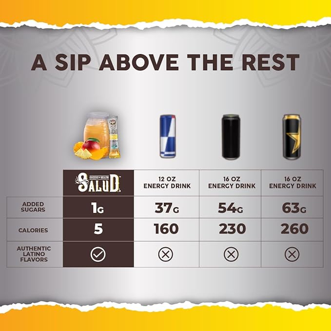 - US vs THEM - Unlike traditional energy drinks loaded with sugars, Salud will turn plain water into a mouth-watering Agua Fresca drink with only 1g of added sugar and 5 calories per serving. You can feel good about starting your mornings and workouts with Salud!