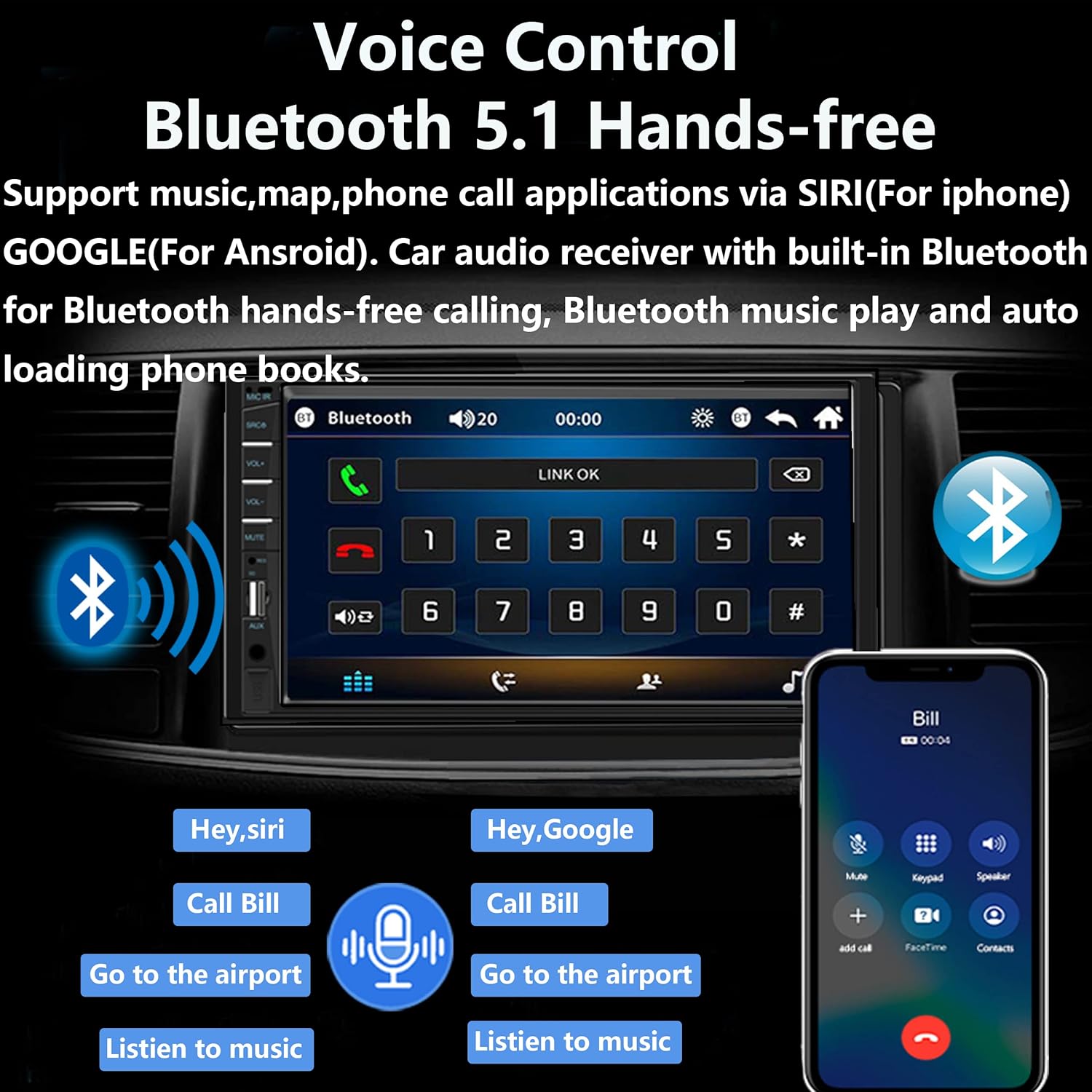 - ăCar Stereo with Carplay & Android AutoăThis car stereo double din radio compatible with Apple Carplay and Android Auto which allows you to get voice control, Siri/Google assistant help you access the your phone functions including calls, map navigation, email, music, messages, etc. while you stay focused on the road. With voice Assistant, help you focus on the road and have fun along the way.