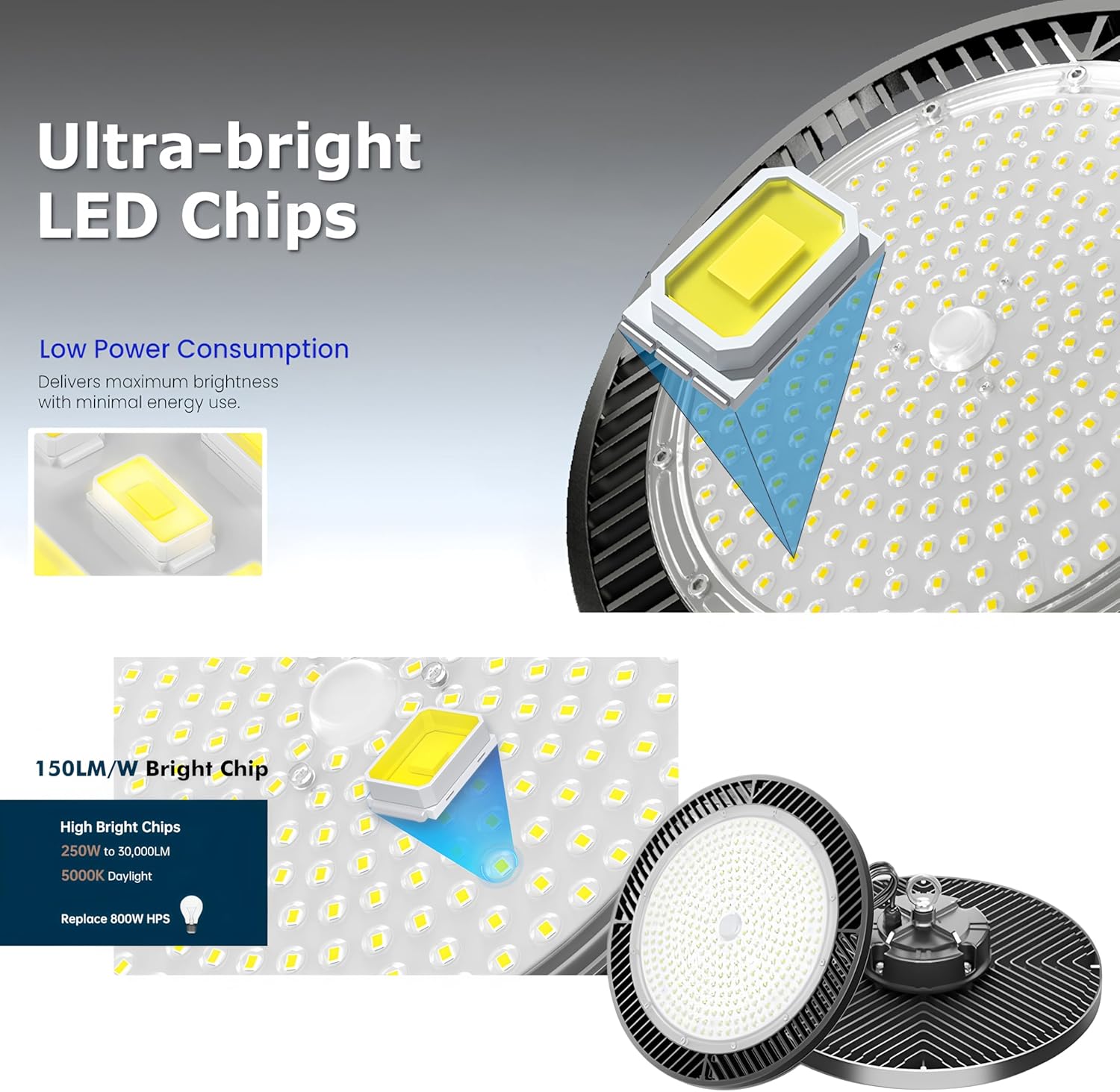 - ✔️【Super Bright&Energy Saving】250W LED high bay garage light are use high brightness SMD3030 LED with total 30000lm, Eqv.to 2500W HIP fixture, energy saving up to 80% on your electricity bill. 6000K daylight provides clear and bright lighting effect.