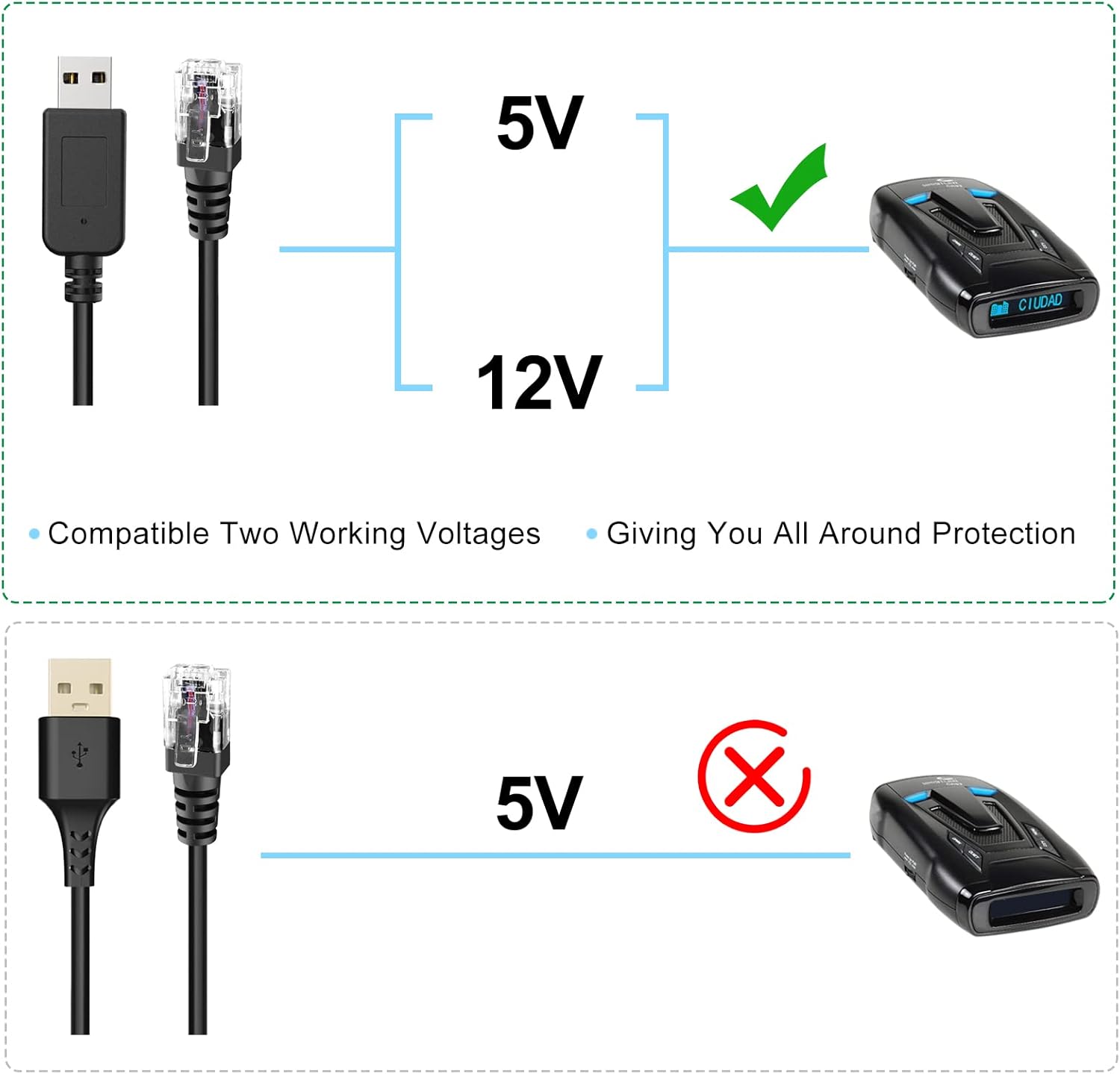 - 【Stable Working Performance】The radar detector cable adopts a new chip encryption technology to ensure that the radar detector can be stably turned on when the cable is connected to 5V or 12V USB interfaces,giving you all around protection wherever your adventures take you.