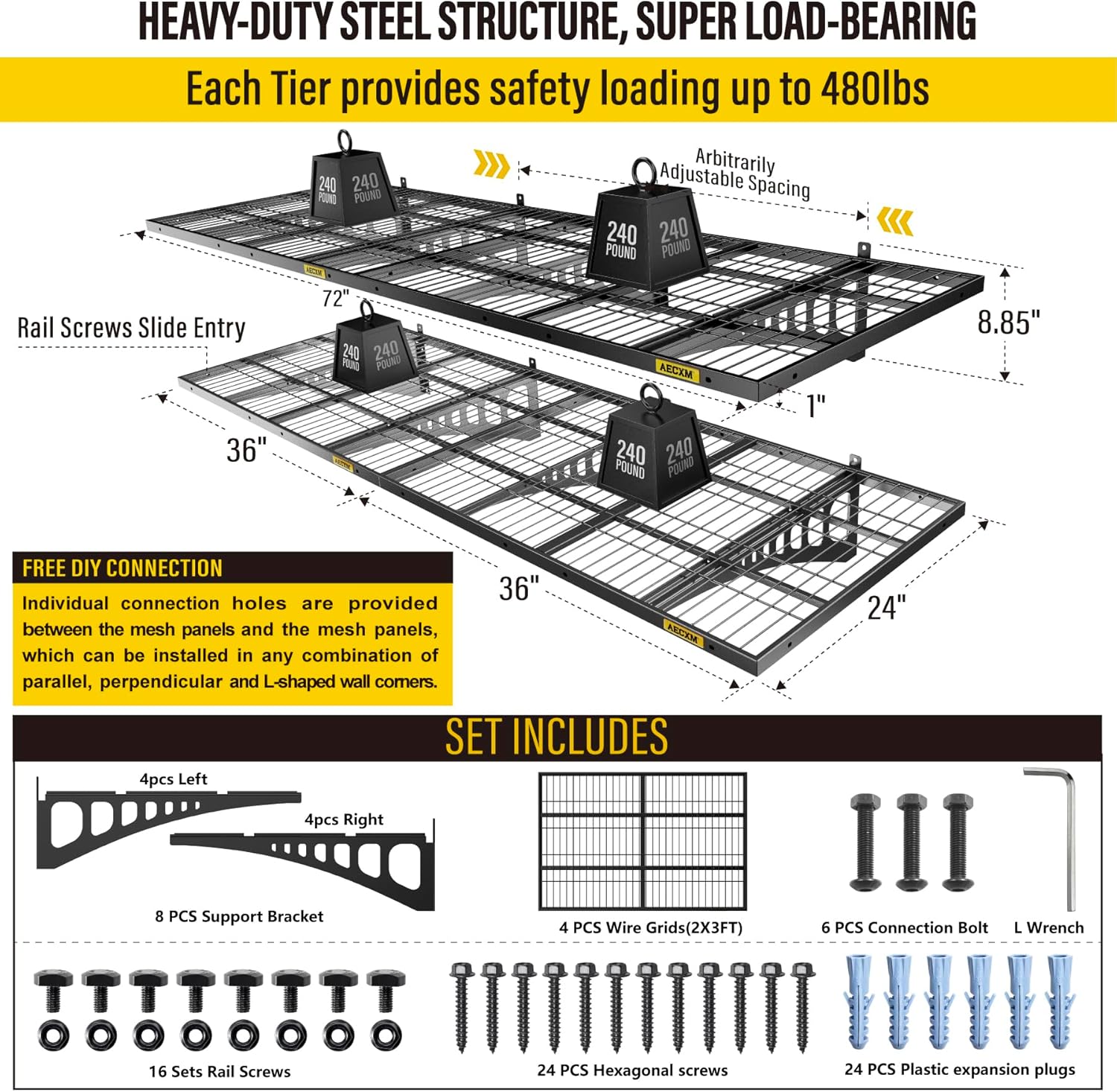 - 1120 lbs Load Tested: Our garage wall shelves undergo rigorous testing, with each individual unit supporting 280 lbs. The 4-pack (2x3ft) offers a total weight capacity of 1120 lbs