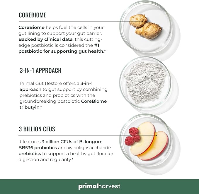 Primal Harvest 2 Pack, Restore for Gut Health, Primal Gut Restore w/POSTbiotics, PREbiotics and PRObiotics for Women and Men, 60 CT - Digestion, Colon Cleanse, Helps Leaky Gut Repair