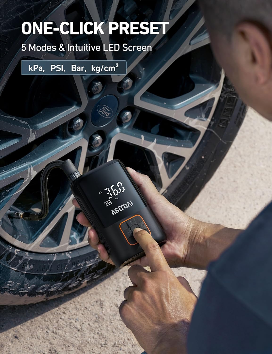 - 1-Minute Fast Inflation & High-Performance Metal Cylinder: The portable tire inflator includes a metal cylinder that delivers a 30% longer service life and excellent performance.This air compressor provides a maximum pressure of 150 PSI and 32L/Min airflow, inflating a tire from 29-36PSI in one minute and 0-36PSI in less than 6 minutes. The AstroAI cordless air pump brings you dynamic trip, making every trip a breeze. (Test data from a 185/65/R15 standard tire.)