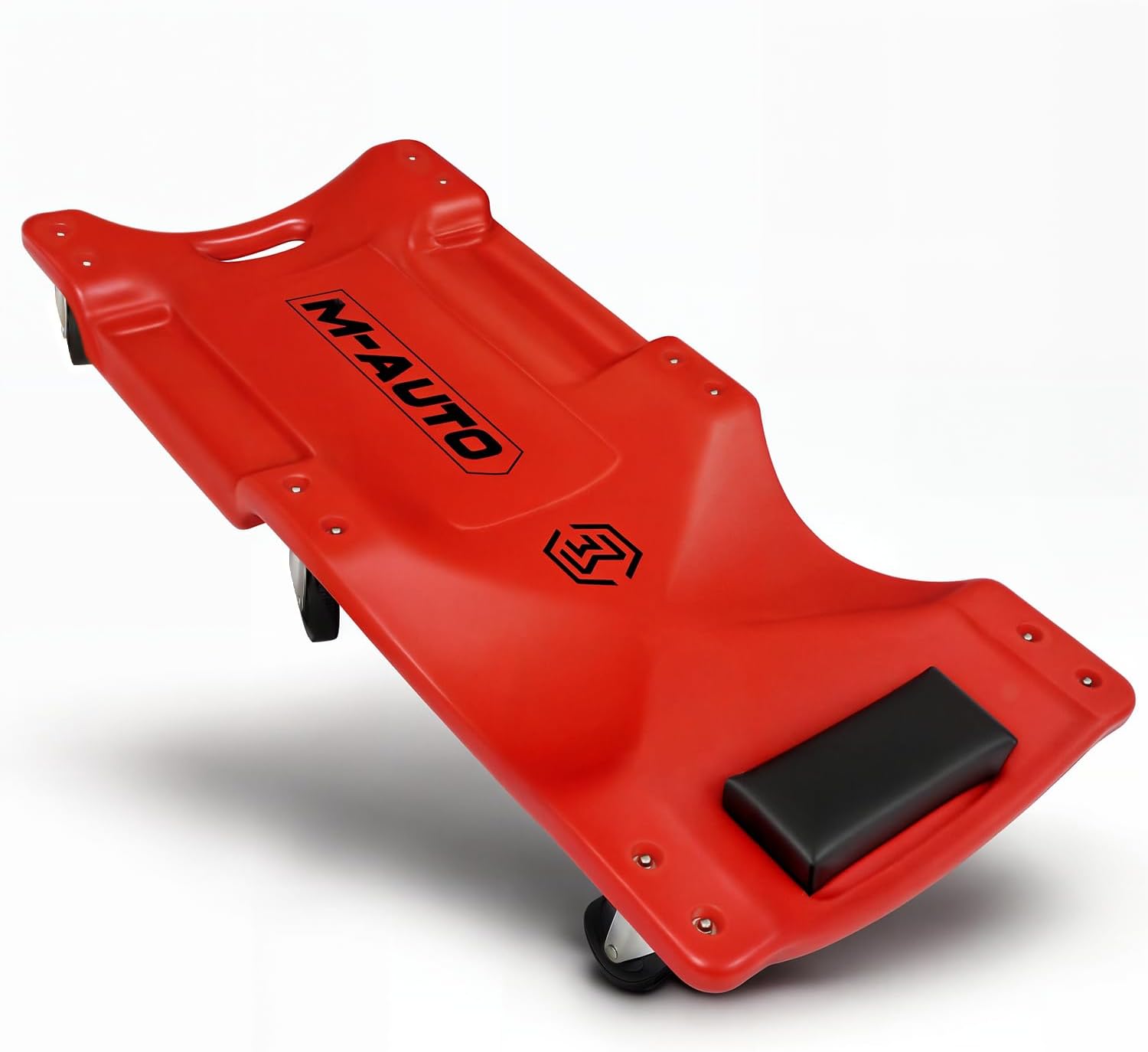 M-AUTO Plastic Rolling Garage Creeper with Padded Headrest 36" Light Weight Automotive Creeper Mechanic Cart with Dual Tool Trays and Noiseless Casters, Red