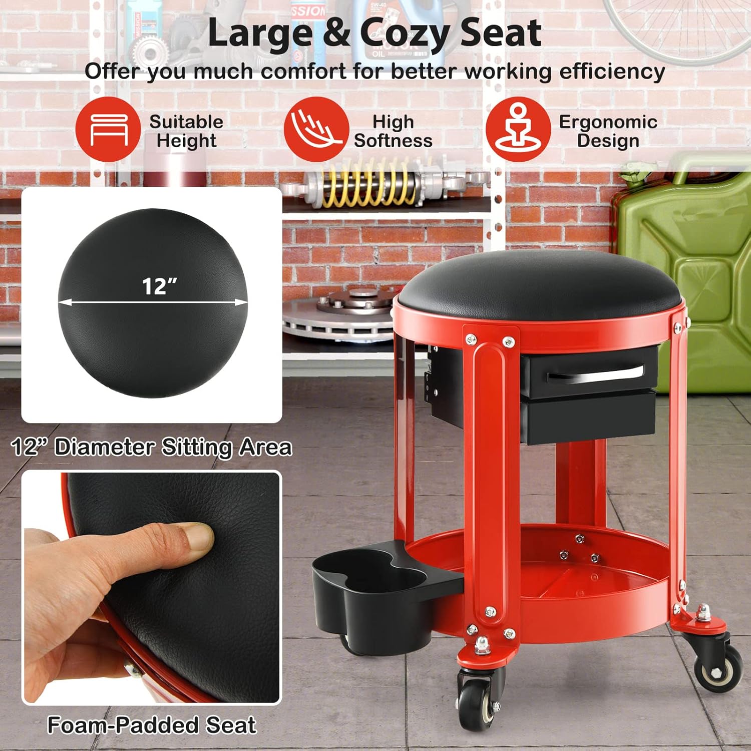 S AFSTAR Garage Shop Roller Seats, Adjustable Pneumatic Rolling Creeper Stool W/Removable Padded Seat, 2-Direction Drawers, Twin Can Holder, Round Mechanic Rolling Stool, 330 LBS Max Load