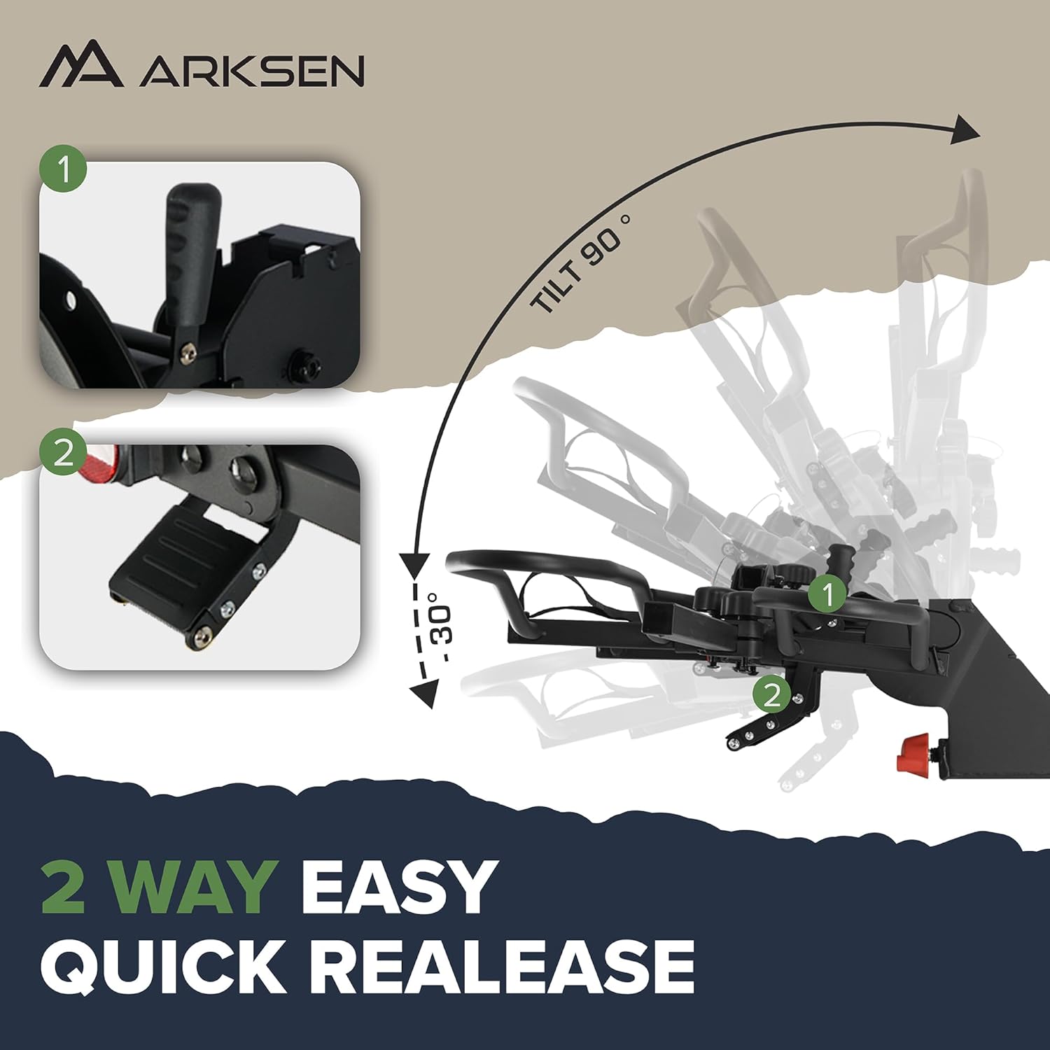 Arksen 2" Hitch Mounted Foldable Rack Quick Release Handle Smart Tilting 2-Bike Platform Style Carrier for Standard, Fat Tire, and Electric Bicycles -160 lbs Heavy Weight Capacity